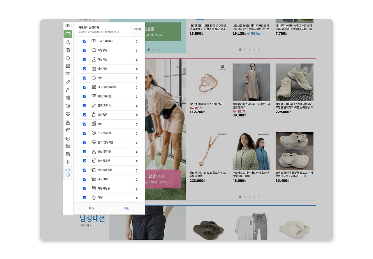 나를 따라다니는 바로가기 : 무심결에 스크롤을 하다 보면 지나친 상단의 카테고리를 찾기가 어렵다. 원하는 게 아래 있는 카테고리에 있다면 계속 스크롤을 내리며 불필요한 상품과 시간을 낭비해야 한다. 이럴 때를 대비해 쿠팡은 왼쪽에 원하는 카테고리를 바로 갈 수 있다. 바로 갈 수 있을 뿐만 아니라 주로 사용하는 카테고리, 순서를 내 마음대로 바꿀 수 있다. 원한다면 해당 카테고리의 노출 여부를 관리할 수 있다. 많은 카테고리를 노출하지 않고, 필요한 카테고리만 불러온다면 불러올 이미지와 상품 데이터가 적어지기 때문에 스크롤을 내릴 때 로딩 속도가 이전보다 단축될 수 있다.