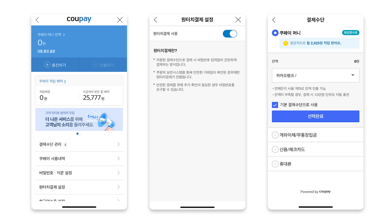 뿌듯한 혜택 금액 결산, 원터치 결제와 쿠페이 : 그동안 얼마를 절약을 했는지 확인할 수 있다면 현명한 소비를 했다는 뿌듯함을 느낄 수 있다. 돈을 지출하면서 한층 더 뿌듯해질 수 있는 정보를 제공하고, 결제는 간편하게 이뤄질 수 있는 원터치 결제 설정으로 상품 구매를 결정한다면 구매 행동을 빠르게 끝낼 수 있게 만들어준다. 한 번만 카드와 계좌이체를 등록해두면 이후에는 다시 정보를 기입하지 않아도 된다. 오직 소비자가 할 일은 구매 결정과 이후 지금까지 받은 혜택 금액을 확인하는 일이다.