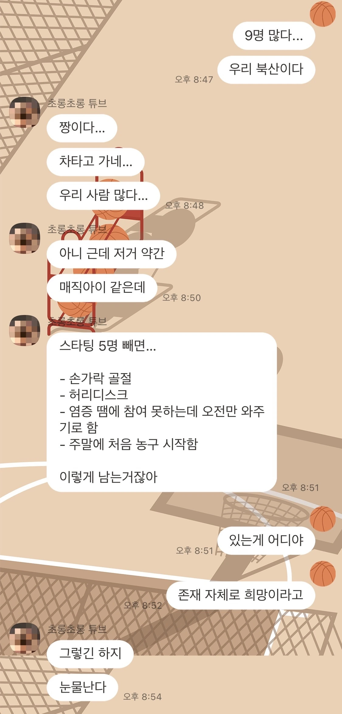 코치님께 이전에 레슨을 받던 분들과, 나와 함께 농구를 시작한 분들이 모였다. 유니폼도 맞추고, 등번호도 이야기했다. 등번호는 어떤 번호를 할까 고민을 많이 했다. 슬램덩크에서 가장 좋아하는 캐릭터 번호를 하려고 했다가 선점당해서 다른 번호를 하기도 하고, 원래 하고 싶었던 번호를 가진 분이 번호를 바꾸자 동생이 다시 개인톡으로 번호 비었다고 얼른 바꾸라고 하는 연락이 왔다.