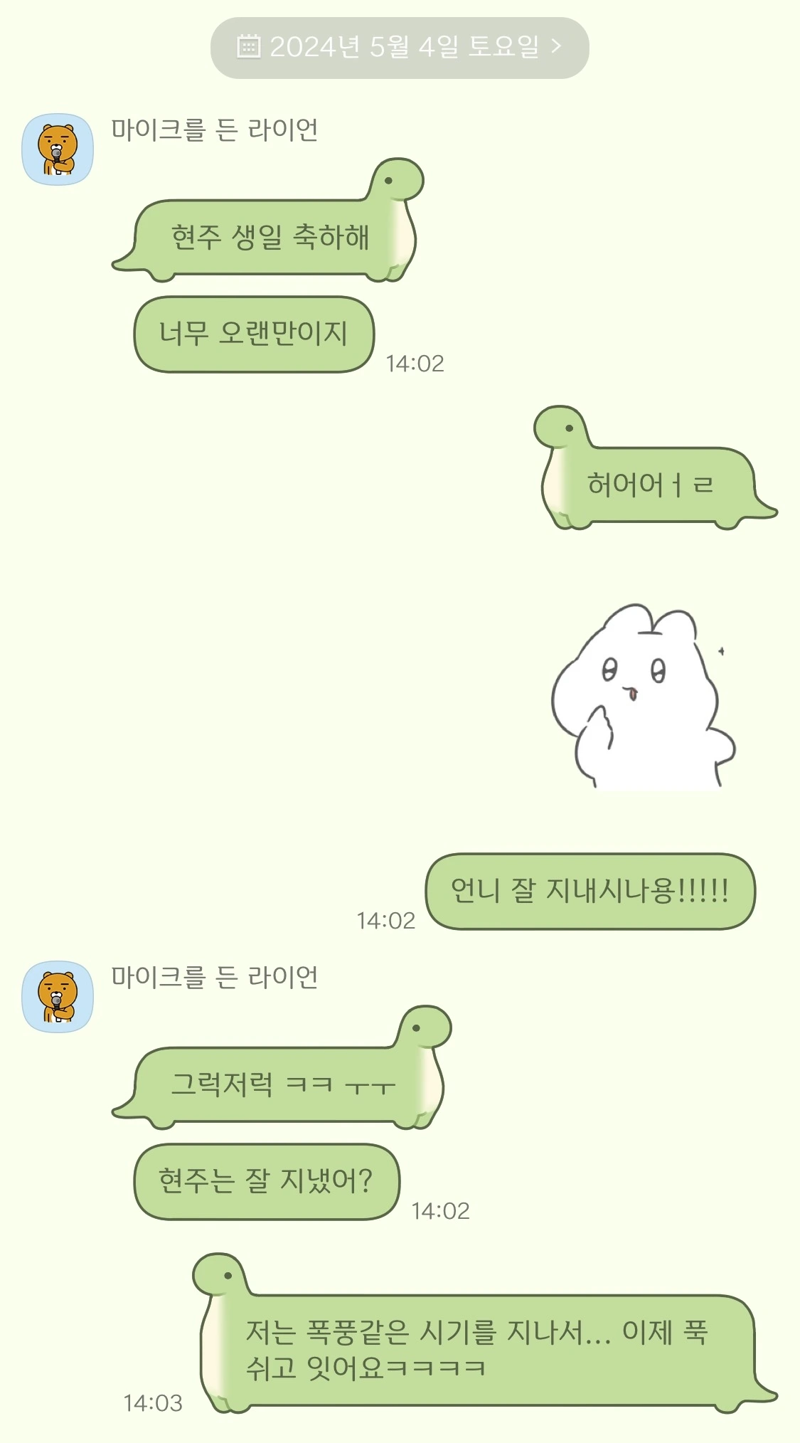 올해, 지금까지 가장 기뻤던 일 중에 하나가 되지 않을까 싶을 정도로 반가운 연락이 찾아왔다. 대학교 학생회장 시절에 나를 많이 도와주고 가장 친하게 지냈던 언니가 몇 년 만에 연락을 보냈다! 연락이 끊겨서 슬펐던 인연이었는데 생일인 걸 보고 용기 내서 연락해 주었다고. 오래 연락하지 못해서 미안하다는 말과 함께 생일 케이크도 받고, 약속을 잡아 밥도 같이 먹었다. 오 년이 넘는 시간 동안 헤어졌었지만 다시 만나서 어제 보고 헤어진 사이 같이 놀았다.