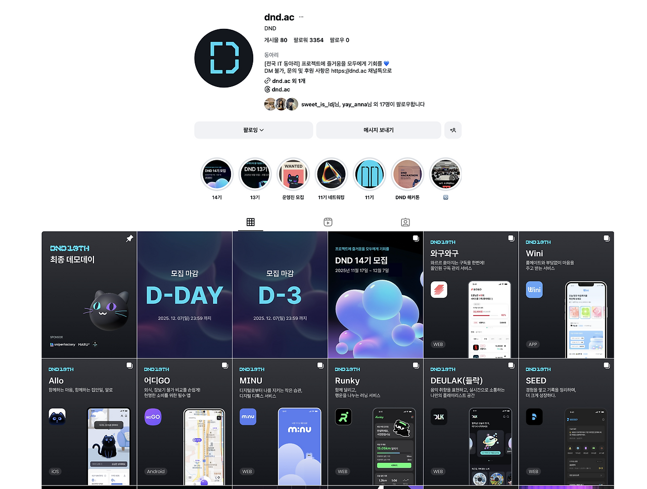DND 운영진으로 여전히 활동 중이다. 21년 5월부터 운영진으로 활동했다. 이번 겨울을 시작으로 14기가 시작되면, 5-14기 동안 많은 디자이너와 개발자를 만나서 8주간의 서비스를 만드는데 도움을 주게 되는, 나름 경력이 긴 대외활동이다. 매번 기수마다 새로운 서비스가 나오고 배포까지 이어질 수 있도록 도와주는 게 참 뜻깊고 즐거운 일이라 길게 이어갈 수 있었다.