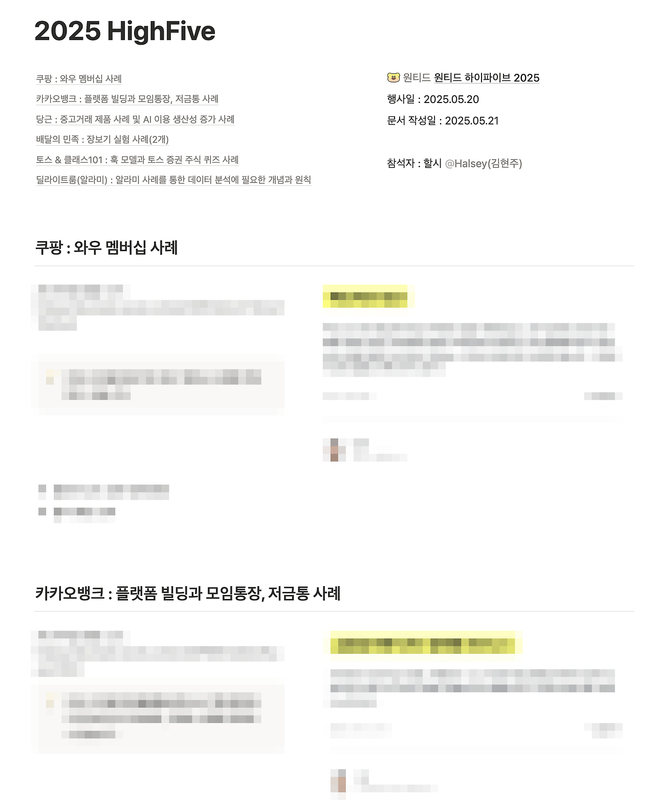 원티드에서 주최한 콘퍼런스에 참여해서 다양한 회사에서의 고민과 실험방법, 문제 정의에 대해서 들었다. 해당일에는 제품 배포일이라서 콘퍼런스 기록을 하면서 실시간으로 제품 테스트와 모니터링도 하느라 정신없었지만, 콘퍼런스 내용도 열심히 정리해 팀원들에게 공유했다.
