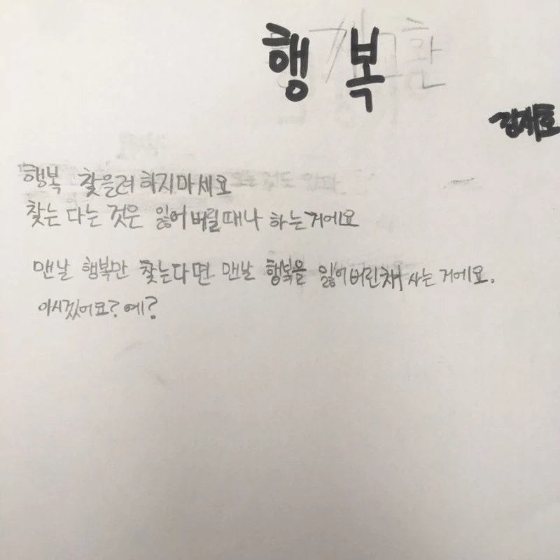 모든 학생들이 시 짓기에 집중한 건 물론 아니었다. 맨 뒷자리에 앉아있던 재호는 사십오 분 내내 앞자리에 앉은 친구를 건들고 떠들면서 장난을 쳤다. 드디어 무언갈 쓰는 것 같길래 가까이 가보니 종이에 적힌 건 친구를 놀리는 시였다. 보다 못해 이번 시간에 쓴 시를 모두 걷어갈 테니 행복에 대한 시를 제대로 써보라고 주의를 줬다. 그랬더니 오분도 안 되어 새로운 시를 완성했다. 이게 바로 그것이다.