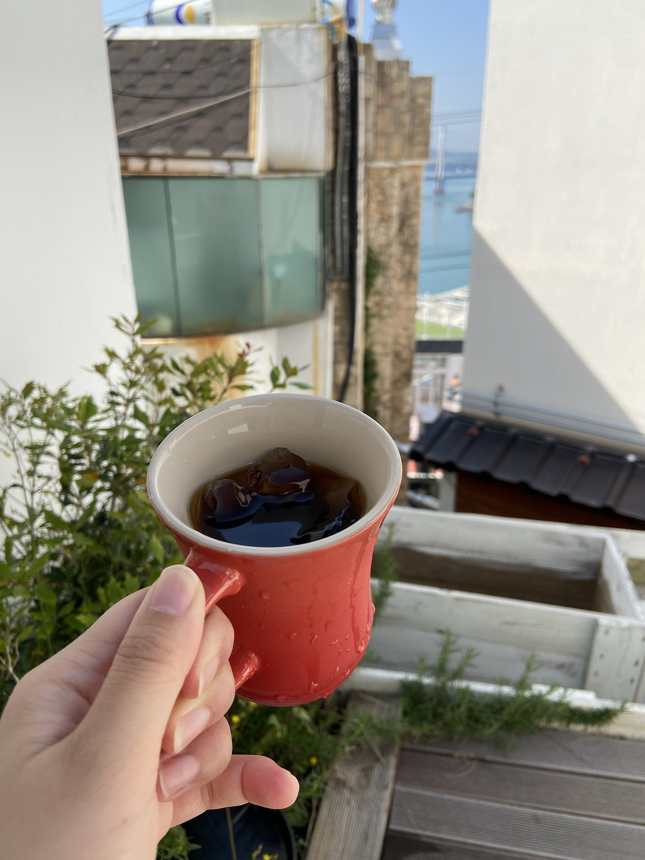 바다가 빼꼼 보이던 사랑스러운 마당. 호스트가 키우는 귀여운 화분들이 오종종하게 모여 있었고, 빨래 건조대를 펼쳐놓으면 거의 다 들어차는 아담한 공간이 있었다. 또, 세 명 정도가 둘러앉을 수 있는 작은 파라솔 테이블이 놓여 있었지. 더위는 아직 오지 않았고, 적당한 햇살이 내리쬈다. 그곳에서 나는 새소리를 듣다가 뱃고동 소릴 듣다가 괜히 재즈를 틀어놓고 책을 읽으며 모닝커피를 마셨다. 생각해 보니 모닝커피라는 말은 있어도 점심과 저녁에 먹는 커피를 런치 커피, 이브닝 커피라고 부르진 않았다. 그렇게 모닝커피는 신성한 것이다. 본래 모닝커피의 용도는-비록 아침부터 카페인을 수혈하는 용도로 변질되었으나-아침의 안온함을, 느긋한 여유를 즐기는 것이었으리라.