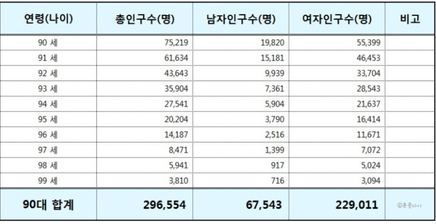 셋째 60대 남녀간에 건강 상태가 차이 난다. 60대 초반까지는 남녀 인구수가 비슷하지만 65세를 넘기면서 부터는 남성 인구수가 더 적어진다. 여자 100명을 기준으로 남자의 숫자를 보면 60세 102명, 65세 97명, 70세 90명, 80세 70명, 90세 35명, 100세 20명으로 줄어든다. 60세에는 남자가 많았으나 65세에 어자가 많다는 것은 60이후 남자 사망자가 증가하는 것이다. 죽기 몇년전 부터 건강이 나빠지는 것을 고려하면, 60넘으면 남자 건강이 여자보다 훨씬 더 빨리 나빠진다는 의미이다.