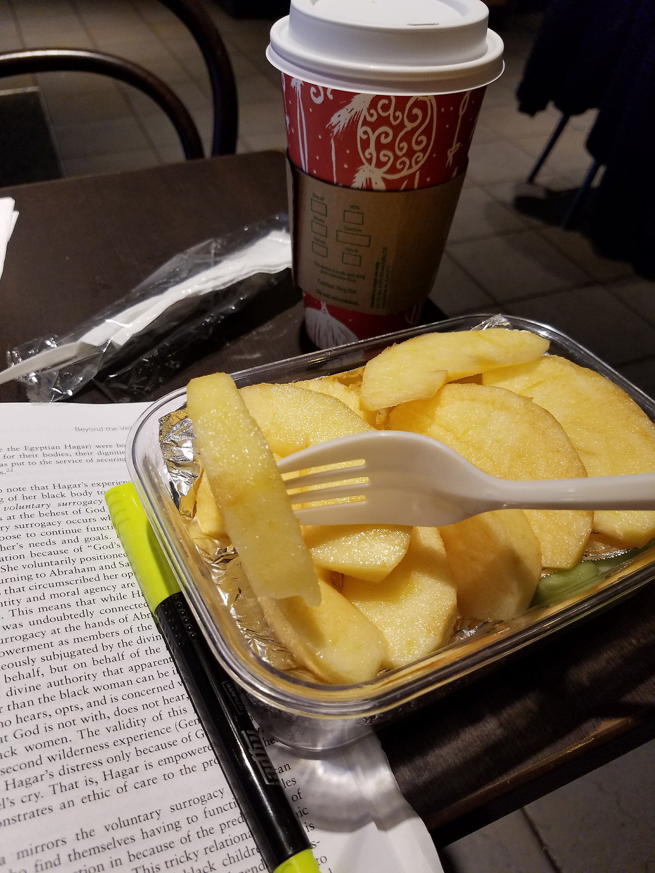 서둘러 나가는 나에게 남편이 챙겨 먹으라며 싸준 사과와 따뜻한 커피.