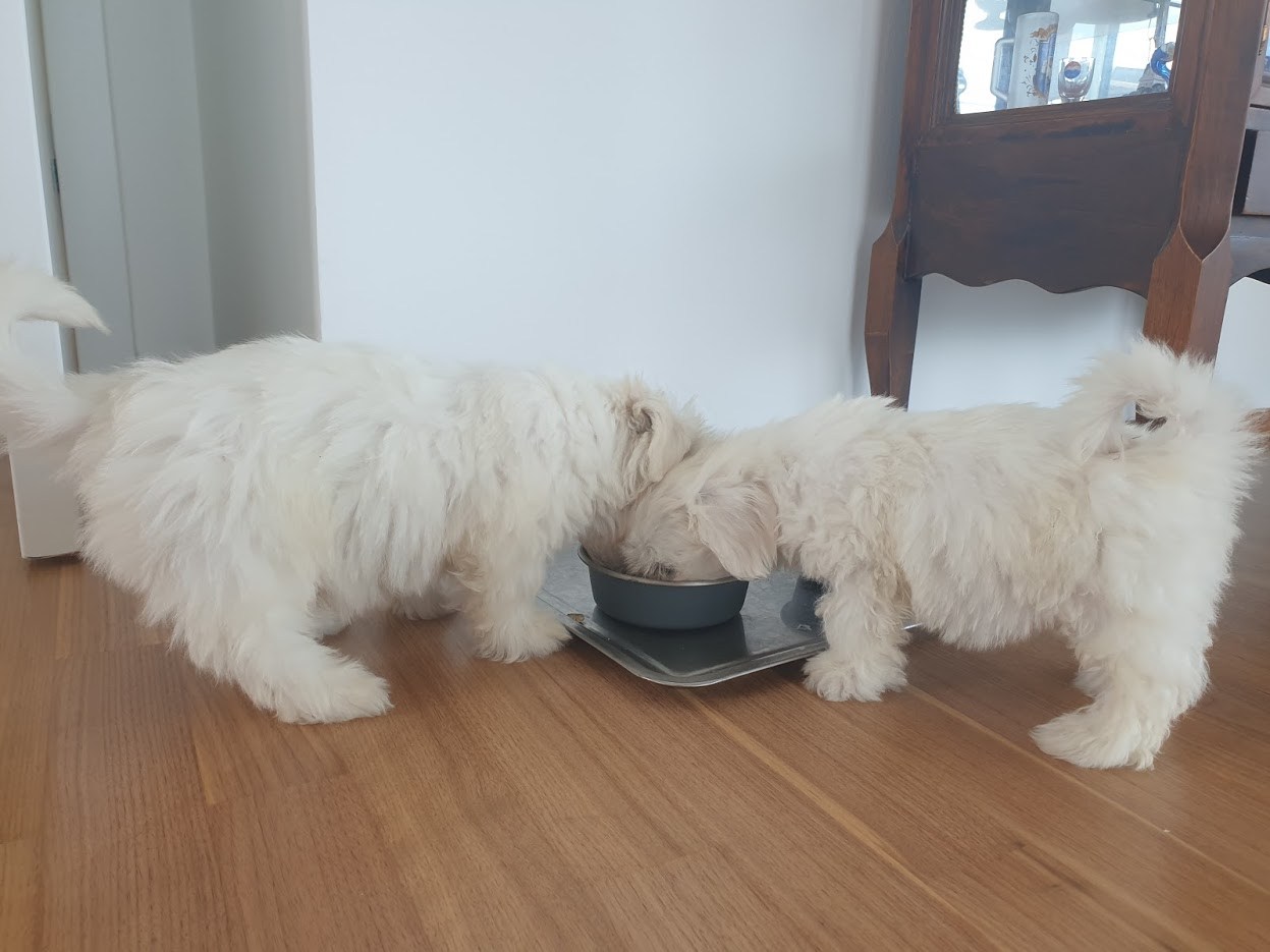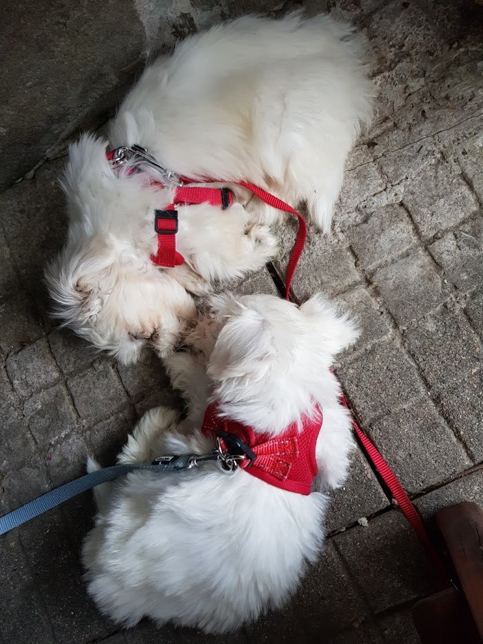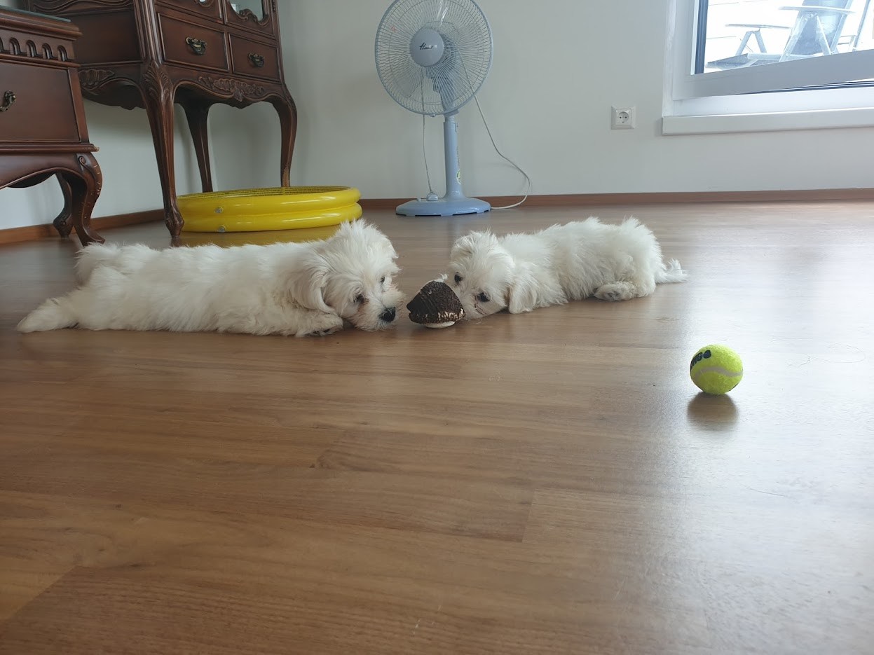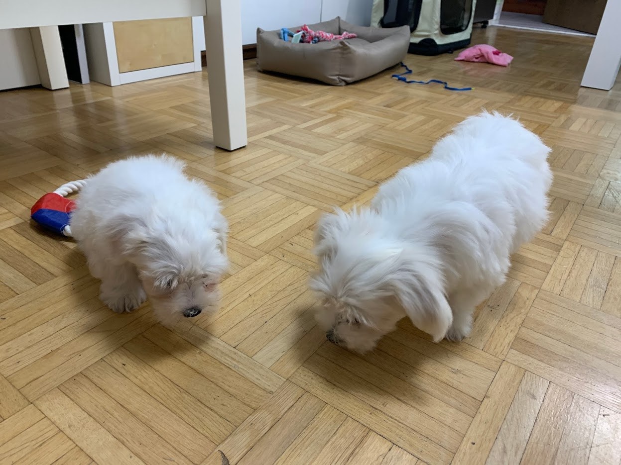 그런데 다음날 과외쌤에게서 연락이 왔다. 주니가 보내준 말티즈 꼬물이 4형제 사진을 보고 마음이 너무 설레어 남편과 상의 끝에 그중 한 마리를 키우기로 결정했다는 것이다. 이렇게 해서 훈데베트레웅 블루마우에 살던 말티즈 강아지 4형제 중 두 아이가 우리 가족과 과외쌤 가족 품에 안기게 되었다.