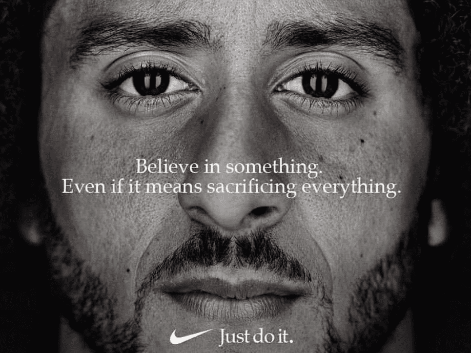 인종차별을 반대하는 미식축구 선수 콜린 캐퍼닉의 얼굴에 "신념을 가져라, 모든 것을 희생해야 할지라도"라는 카피를 새겨 넣어 강렬한 메시지를 전달한 나이키 광고