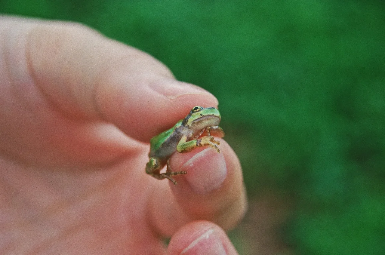 청개구리가 보인다는 건 주변에 친구들이 많이 있단 소리다. 아니나 다를까 몇 걸음 못가 길가에서 청개구리를 발견했다. 개구리는 빠르다. 하지만 잡을 수 없는 것도 아니다. 살금살금 다가가 들어 올렸다. 마치 턱을 괴고 있는 듯한 자세로 잡혔다. 어디 고민 있으면 얘기해보란 듯한 느낌도 난다. 이들의 피부는 약하기에 뜨거운 사람의 손이 닿으면 금방 메마른다. 마치 세안 후 로션을 바르지 않은 겨울 피부 같달까. 그래서 오래 잡고 있으면 예의가 아니다. 되도록 손바닥에 올려놓거나 금방 놔줘야 한다. 만나서 반가웠단 인사와 함께. 금방 시야에서 사라진다.
