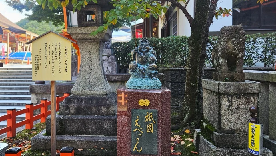 교토 기온 입구의 야스카 신사(八坂神社)에는 옛 복장을 하고 후덕하게 웃는 작은 브론즈 노인상이 서 있다. 오른손에는 가늘고 긴 낚싯대를 들고 있는데, 가까이서 보면 낚싯대는 브론즈가 아니라 진짜 대나무가 꽂혀 있다. 왼손에는 큼직한 생선을 옆구리에 끼고 있으며, 받침대에는 ‘에벳상(えべっさん)’이라 적혀 있다. 에비스(恵比寿)를 친근하게 부르는 애칭이다.