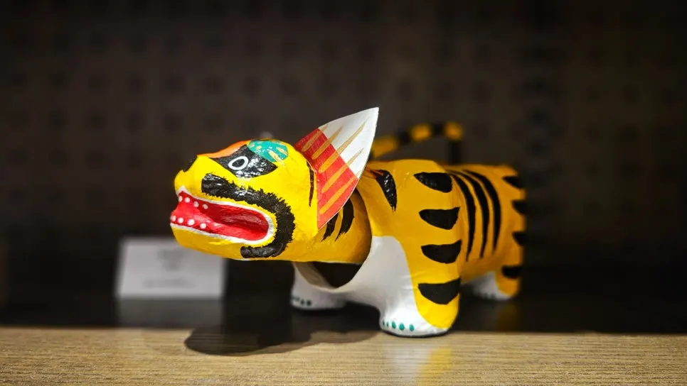 이름만 들으면 맹수를 떠올리지만, 표정은 민화 속 호랑이처럼 느긋하다. 전통 장난감이라기엔 어설프고, 장식품이라기엔 앙증맞다. 그 어정쩡함이 오히려 눈길을 붙든다. 에도 시대 이후 일본 각지에서는 가볍고 값싼 종이공예 장난감이 널리 만들어졌고, 머리를 따로 달아 움직이게 한 ‘구비후리’ 형식도 자연스럽게 자리 잡았다. 구조가 단순한 만큼 지역마다 표정과 비례에 조금씩 차이가 생겼다. 이름은 달라도, 머리는 흔들렸다.