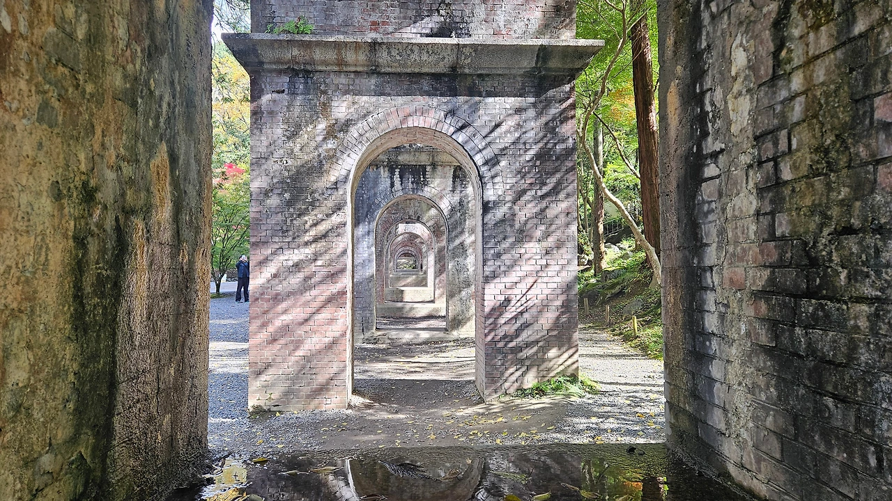 난젠지(南禅寺) 수로각(水路閣)의 붉은 벽돌 아치 아래로 스며드는 코모레비는, 벽돌 표면에 남은 세월의 흔적을 선명하게 드러낸다. 물길이 스쳐 간 자국과 습기를 머금은 곰팡이, 이끼의 얼룩이 겹쳐 독특한 질감을 만들고, 빛과 그림자가 아치 굴곡을 따라 번지며 오래된 구조물이 켜켜이 쌓아온 시간을 보여준다. 가까이 다가서면, 순간순간 달라지는 빛의 장난에 마음이 미묘하게 흔들린다.