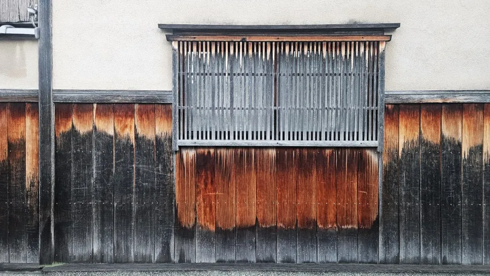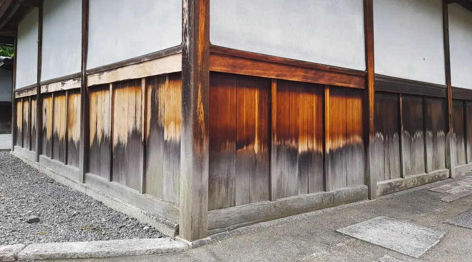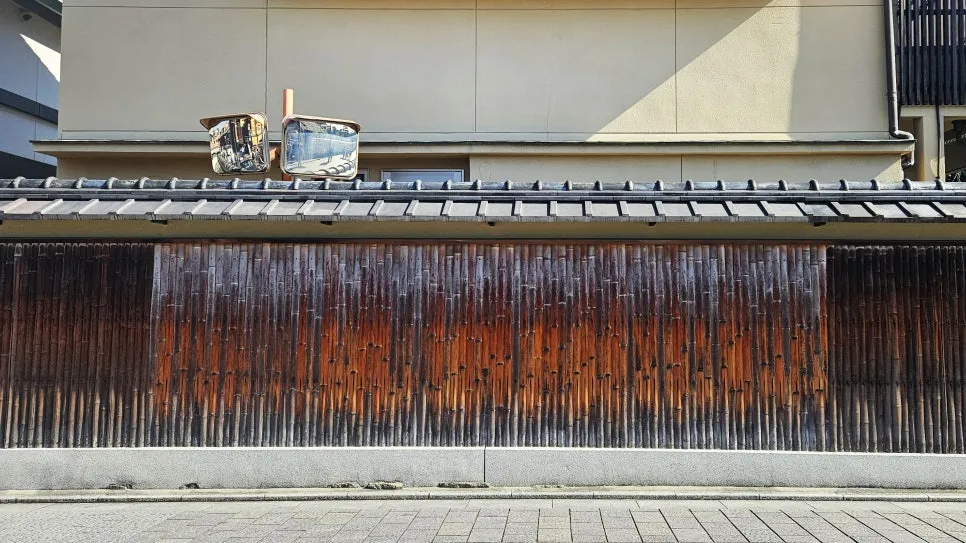 교토의 오래된 담벼락에는 색이 한 가지로 멈춰 있는 곳이 없다. 문이나 담장에 쓰인 목재는 해마다 바람과 계절을 지나며 색을 조금씩 잃고, 장마철 스며든 빗물은 어두운 흔적을 남긴다. 결을 따라 밝은 부분과 그늘진 부분이 서서히 바뀌며, 위에서 아래로, 혹은 아래에서 위로 번지는 색의 차이는 의도적으로 만든 듯 보이지만, 세월과 계절이 만든 그라데이션이다. 그렇게 쌓인 변화가 골목에 교토만의 결을 남긴다.