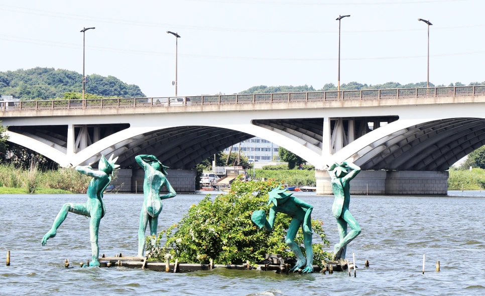 후쿠오카 텐진 지하상가에서 PARCO 백화점으로 오르내리는 에스컬레이터 한가운데, 얕은 물이 흐르는 공간이 마련되어 있다. 그 위에는 여러 개의 갓파 조형물이 놓여 있다. 까르르 웃으며 신나게 물장구치는 아이들처럼 보이는데, 머리에 접시가 없다면 갓파인지 알아보기 어렵다. 도시 한복판에 이런 모습이 있다는 것은, 갓파가 생활 속 상징으로 스며들어 있음을 느끼게 한다.