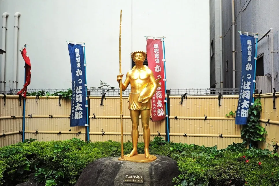갓파(河童)는 원래 강과 연못에 사는 요괴지만, 도시 속에서도 제법 눈에 띈다. 대표적인 사례가 도쿄 최대의 주방 도구 거리로 불리는 갓파바시(かっぱ橋)다. 이름만 보면 갓파와 얽힌 이야기가 있을 것 같지만, 유래는 다르다. 이 일대는 예전부터 비옷인 ‘합파(合羽, 갓파)’를 만들고 말리던 동네였고, 그 풍경 때문에 ‘갓파바시’라는 이름이 붙었다. 발음이 물속 요괴 갓파와 같다는 우연 덕분에 상인들이 재치 있게 마스코트로 삼으면서 지금의 이미지가 굳어졌다. 시장 입구에 세워진 황금색 갓파 조형물도 그런 맥락에서 탄생했다. 왜 초록색이 아니라 황금색일까!