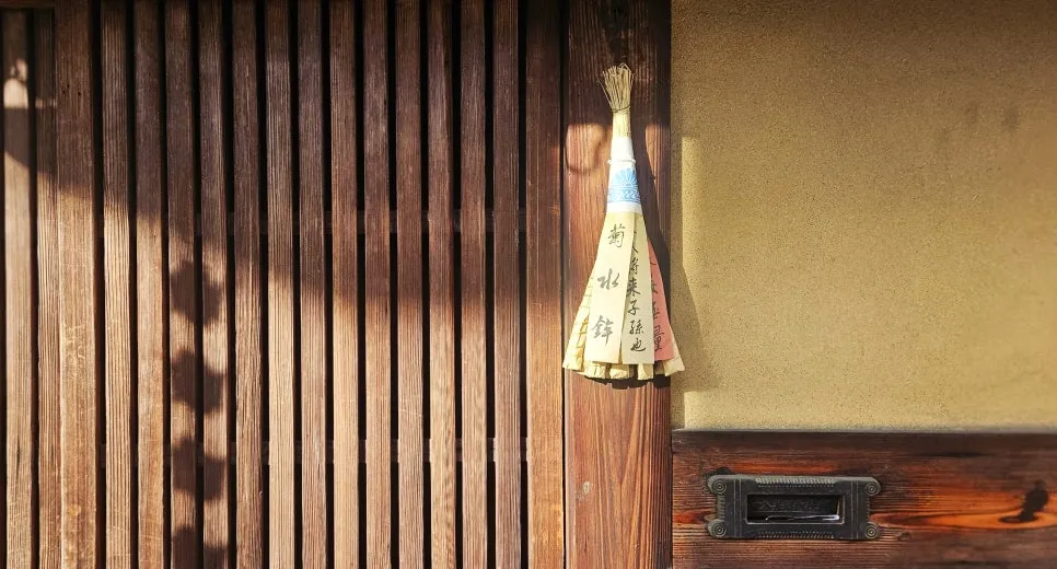 가을이 깊어질 즈음, 교토의 주택과 상점 입구에는 빗자루(ほうき)나 볏짚(稲わら)을 엮은 장식이 걸리는데, 일본에서는 이를 카도카자리(門飾り)라고 부른다. 빗자루는 나쁜 기운을 쓸어내고, 볏짚은 외부에서 들어오는 악운을 막는 의미로, 집의 경계가 되는 문 앞에 걸린다. 마당이나 창고에 있어야 할 물건이, 국경일에 내걸린 국기처럼 집집마다 걸린 풍경이 처음에는 낯설게 느껴졌다.