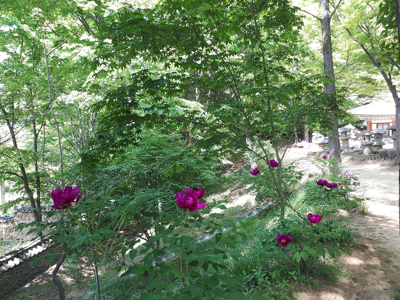 진한 자주빛의 커다란 목단 꽃이 우아하게 피어 있고 커다란 꽃잎안을 들여다보니 꿀벌이 노오란 화분대를 연신 비벼대고 있다.