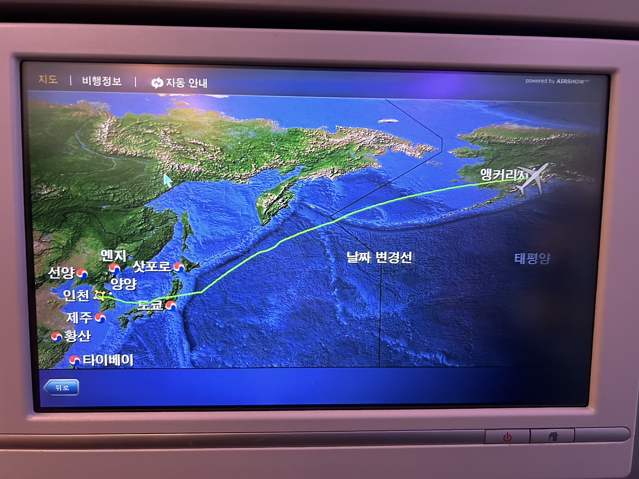 7시간 45분만에 미국 알래스카땅에 닿았다. 방콕이 6시간이니까 이번 여행에서 전세기라 가능했던 얘기다.설레는 맘으로 비행기안 창문을 통해본 알래스카!