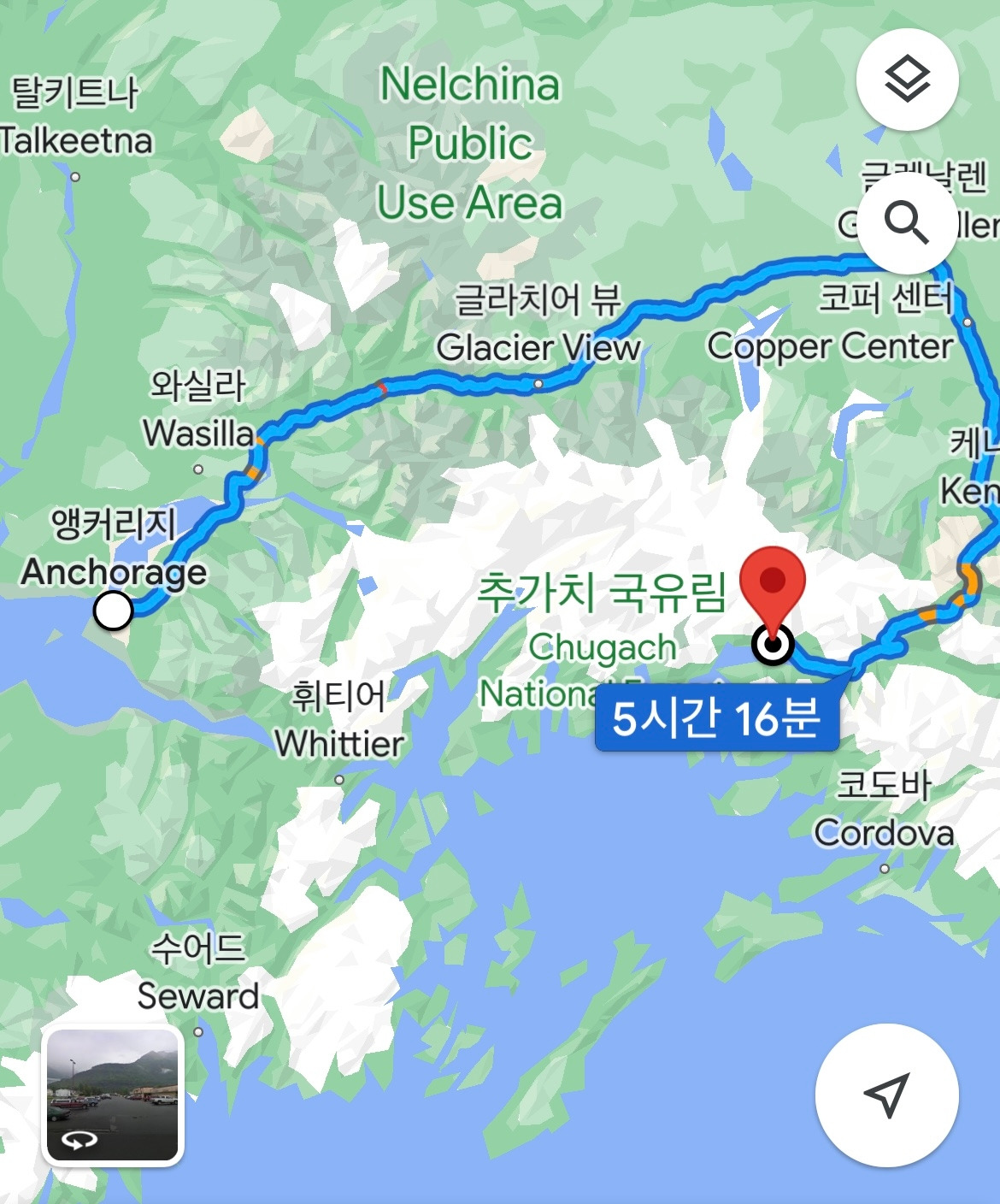 이제 앵커리지를 떠나 발데즈라는 항구도시로 가는 여정이다. 지도에서 보다시피, 차량이동이 길다보니 흔히 택하는 일정은 아니다. 앵커리지 근처 랭겔 세인트 엘리어스 국립공원으로 가는 길에 미러호수에 왔다. 말 그대로 거울처럼 숲이 호수에 반사되어 오늘 아침은 흐리고 비가 약간 흩뿌려 나름 운치가 있었다.