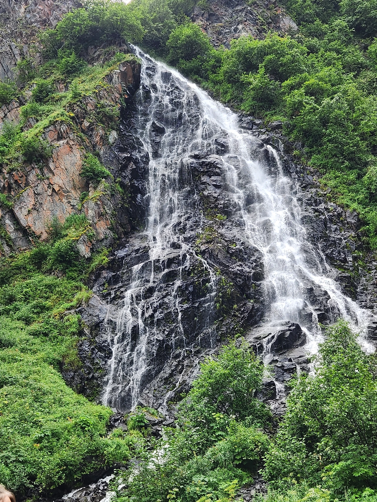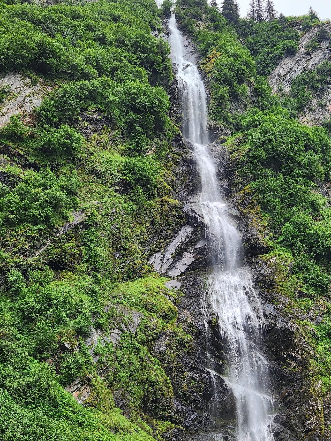발데즈로 가는 중 만난 빙하폭포 bride veil fall(폭포의 흩어지는 물살이 신부 웨딩드레스의 면사포를 닮았다고 붙여진 이름, 같은 이유로 미서부 요세미티 국립공원에도 있음)