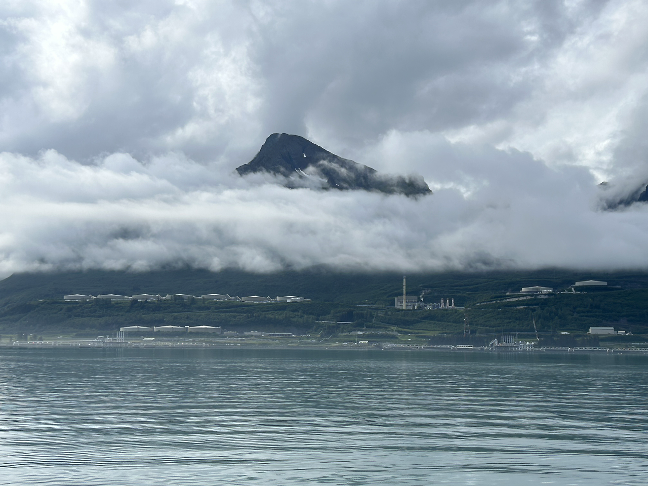 석유수송관의 최종 도착지, 발데즈항 맞은편 해무사이로 석유저장소들이 줄지어 있다. 북부지역에서 채굴된 원유는 석유수송관을 통해 이 곳 발데즈항으로 옮겨지고 알래스카 환경보호차원에서 원유는 캘리포니아 지역으로 이동하여 정유과정을 거쳐 다시 발데즈항으로 온단다.
