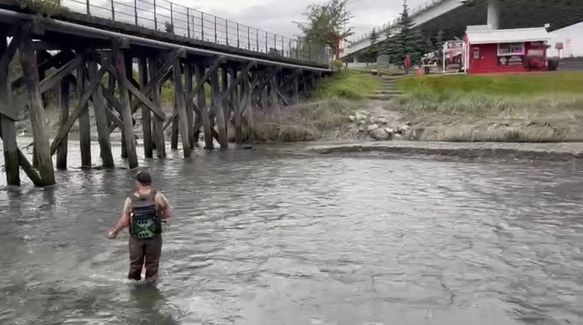 연어입이 아닌 아가미등 다른 부위를 낚아채는 것은 금지라는 뜻으로 이해하고 다가가서보니 그냥 맨손으로도 때려잡을 정도로 강물아래 가까이 있었다.