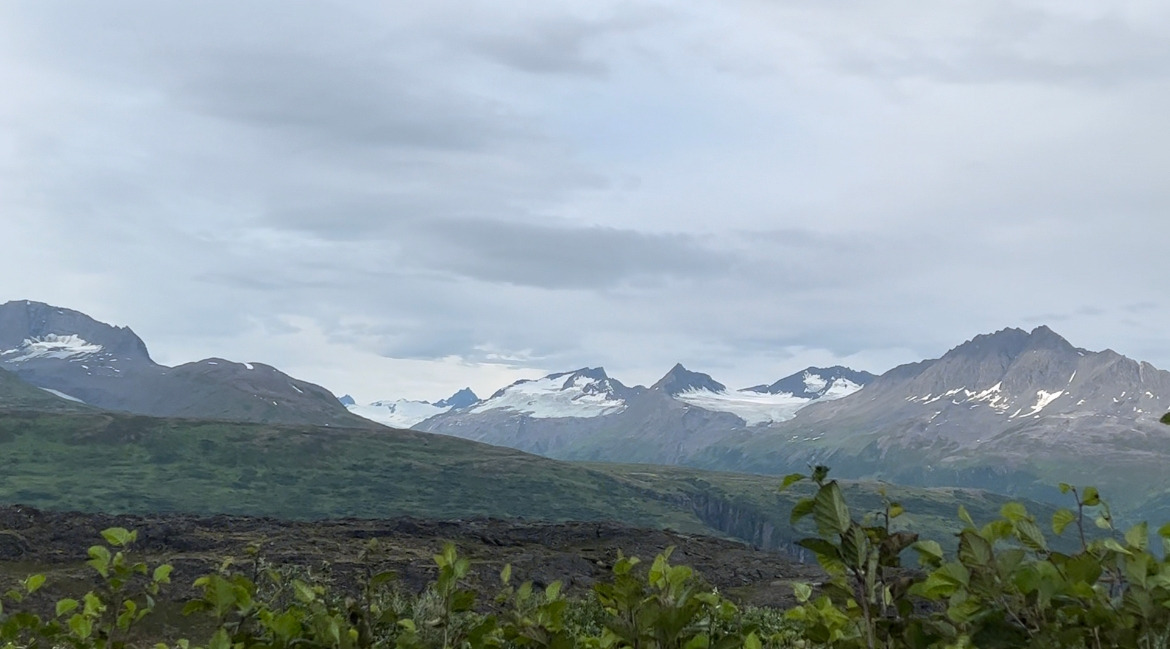 이제 발데즈를 떠나 다시 앵커리지로 돌아가는 길이다. 올 때 스쳐지나온 톰슨패스, 산꼭대기에 여전히 눈이 쌓여있는 산맥이 이어지는 풍경을 차에서 내려 파노라마처럼 한 눈에 담아본다.