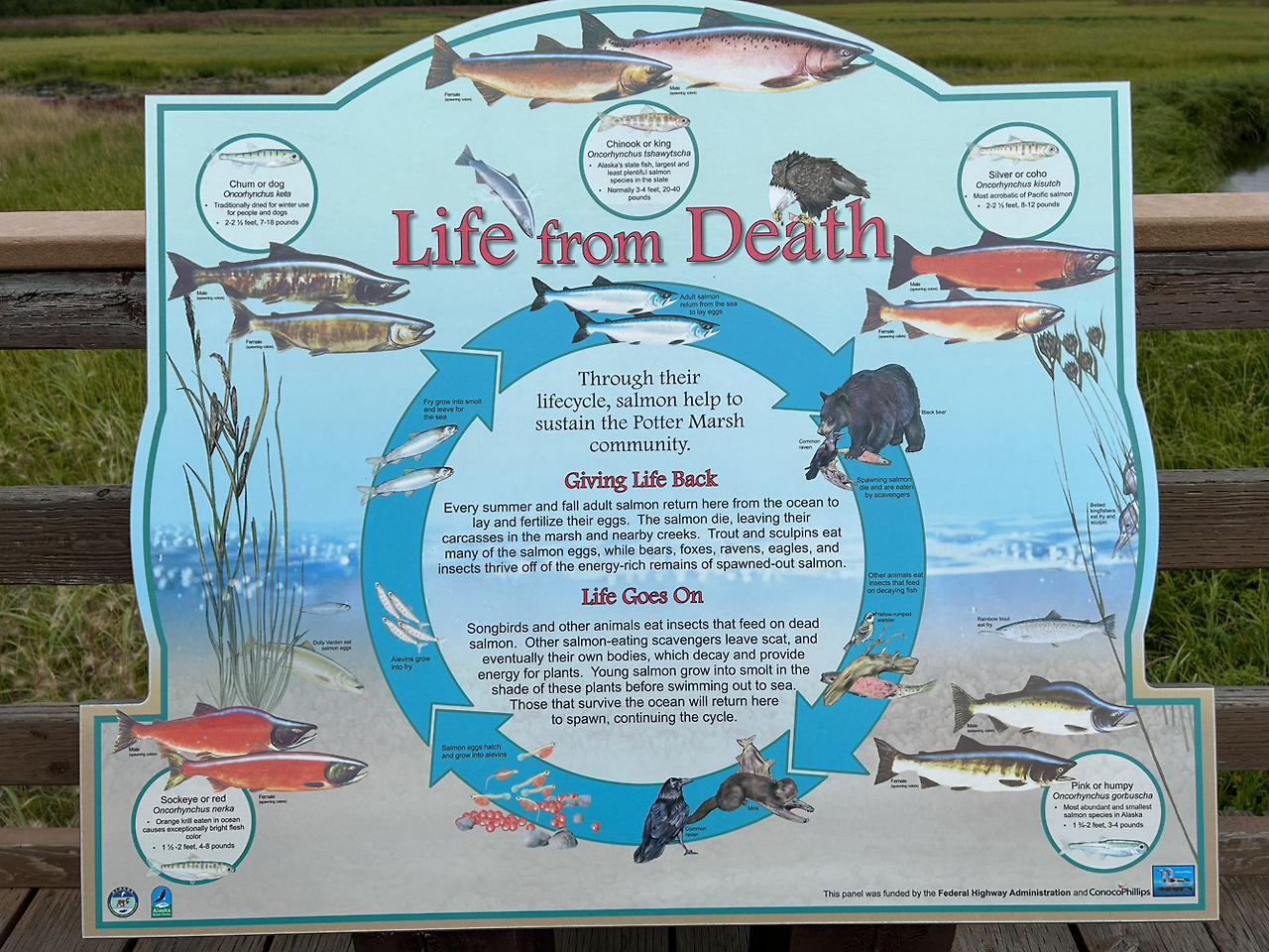 다큐멘터리영상으로만 보다가 내 눈앞에서 치열하게 강물을 거스르는 연어떼들을 보면서 연어한테 감정이입이 되어 안타까운 마음이 컸었다면, 여기서 나는 연어가 곰과 바다사자, 갈매기의 먹이가 되어주니, 이 또한 돌고 돌아 여러 생명을 살리니 이 얼마나 감사한 일이 아닌가하는 생각으로 ‘그럼에도 불구하고 life goes on! ’(삶은 계속된다!) 이 표어를 되새겨본다.