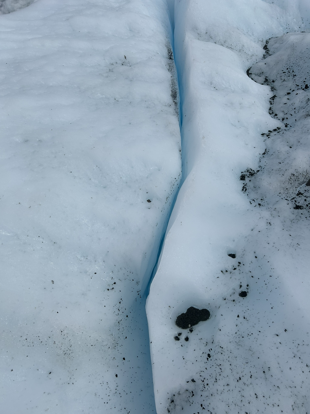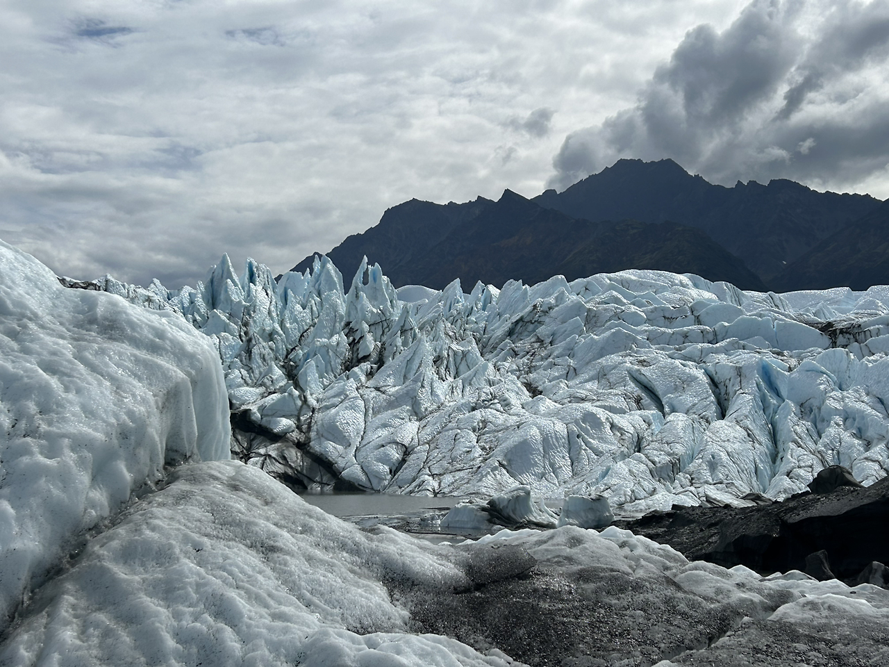 크레바스를 보고 궁금해서 한번 만져봤다. 그냥 얼음덩어리! 전혀 무섭지 않았고 얼음과 빙퇴석이 번갈아가며 쌓인다고 하고 빙퇴석 아래 얼음이 푸른색일수록빙하가 더 단단하다고 한다.