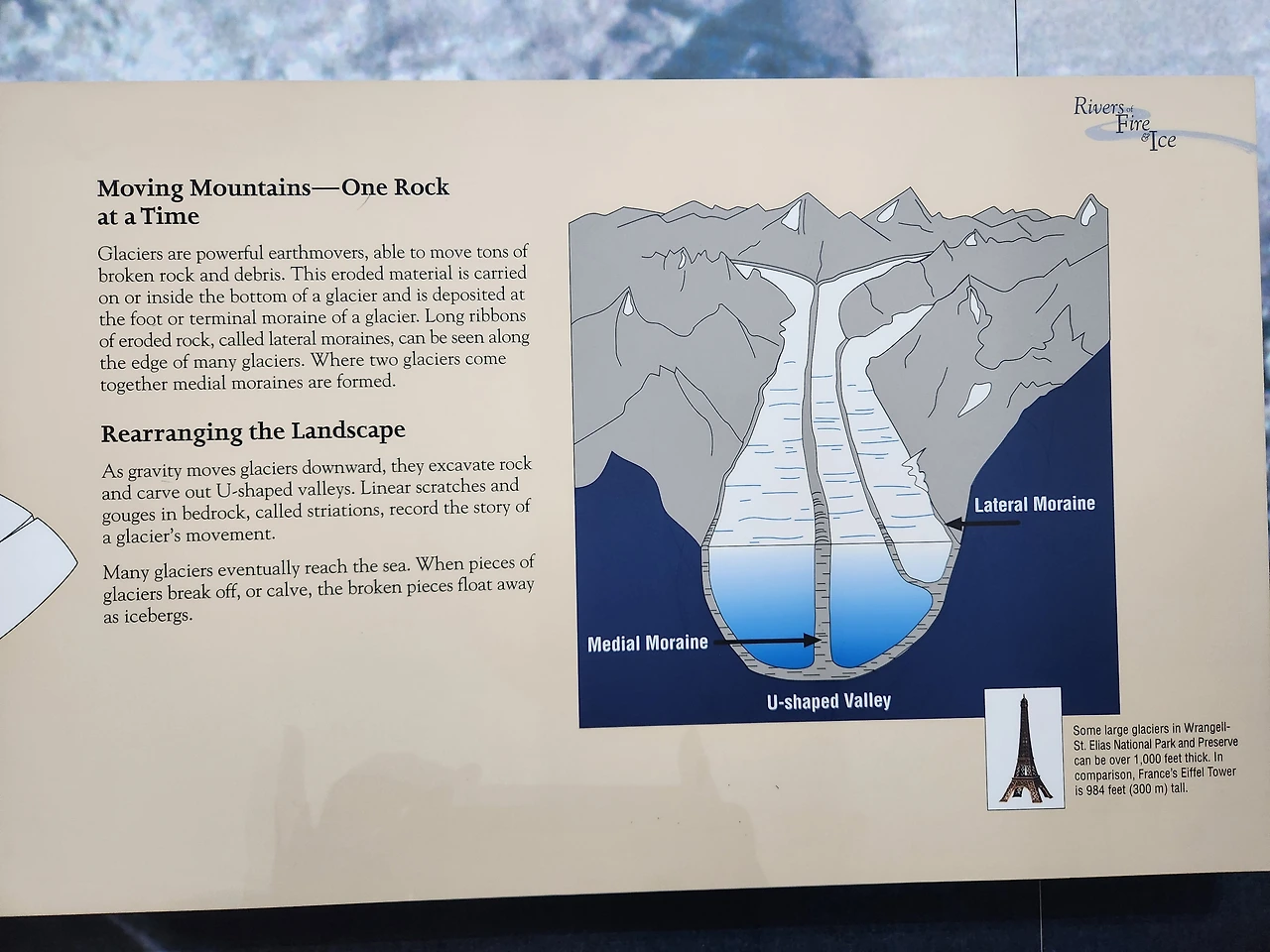 렝겔 세인트 엘리어스 방문자센터에서 확인한 표시판에 따르면 이 밑에 에펠탑높이보다 더 깊이 빙하가 있다는 건데 육안으로 보이는 것만으로 보이지 않는 영구 동토층(permafrost)을 상상하기는 사실 쉽지 않았다.