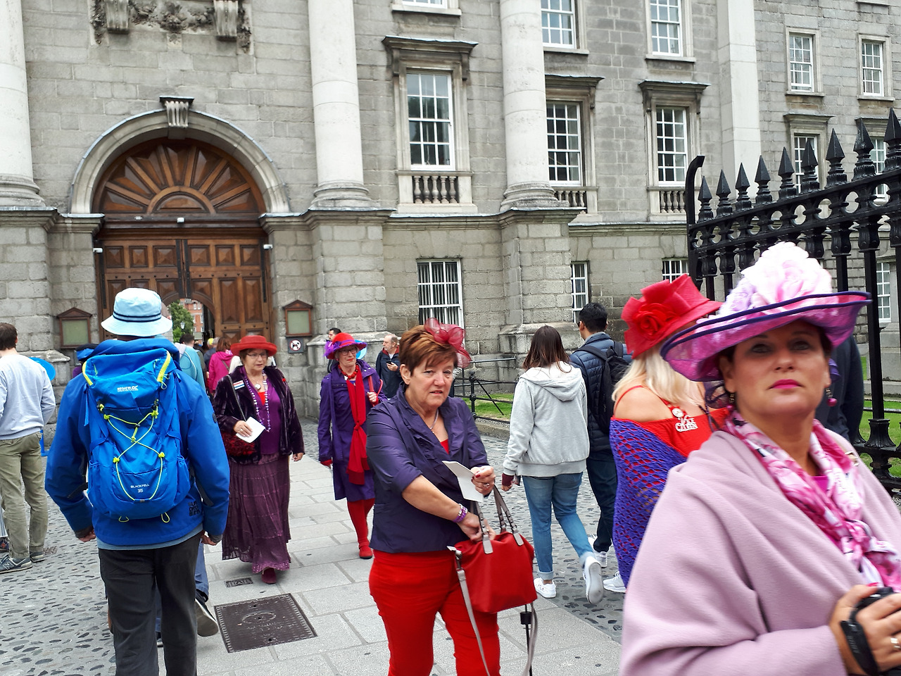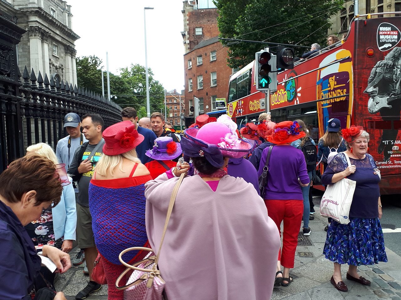 트리니티대학앞에서 나이가 지긋이 들어 보이는 중년 여성들이 언뜻 보고 지나칠 수 없을 만큼 눈에 확 띄는 붉은 색 모자에 보라색 옷을 입고 한껏 화려한 색상의 옷을 입고 무리를 지어 계속해서 나오고 있다. 뭐하는 퍼레이드냐 무슨 행사가 있냐면서 물어보니 The red hat society란다.