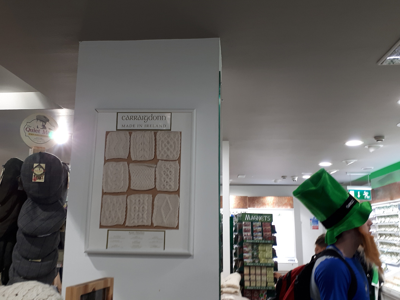 St.patick day( 세인트 패트릭 데이 )도 아닌데 한 남자가 정통 아이리쉬 복장을 하고 기념품샵에 들어왔다. 벽면에 아이리쉬 스웨터 패턴이 붙여져 있다. 양과 소는 영국 뿐 아니라 아일랜드에서도 주된 산업이다. 그래서 사람들이 양모 스웨터 등 겨울 제품들을 기념품으로 많이 사간다.