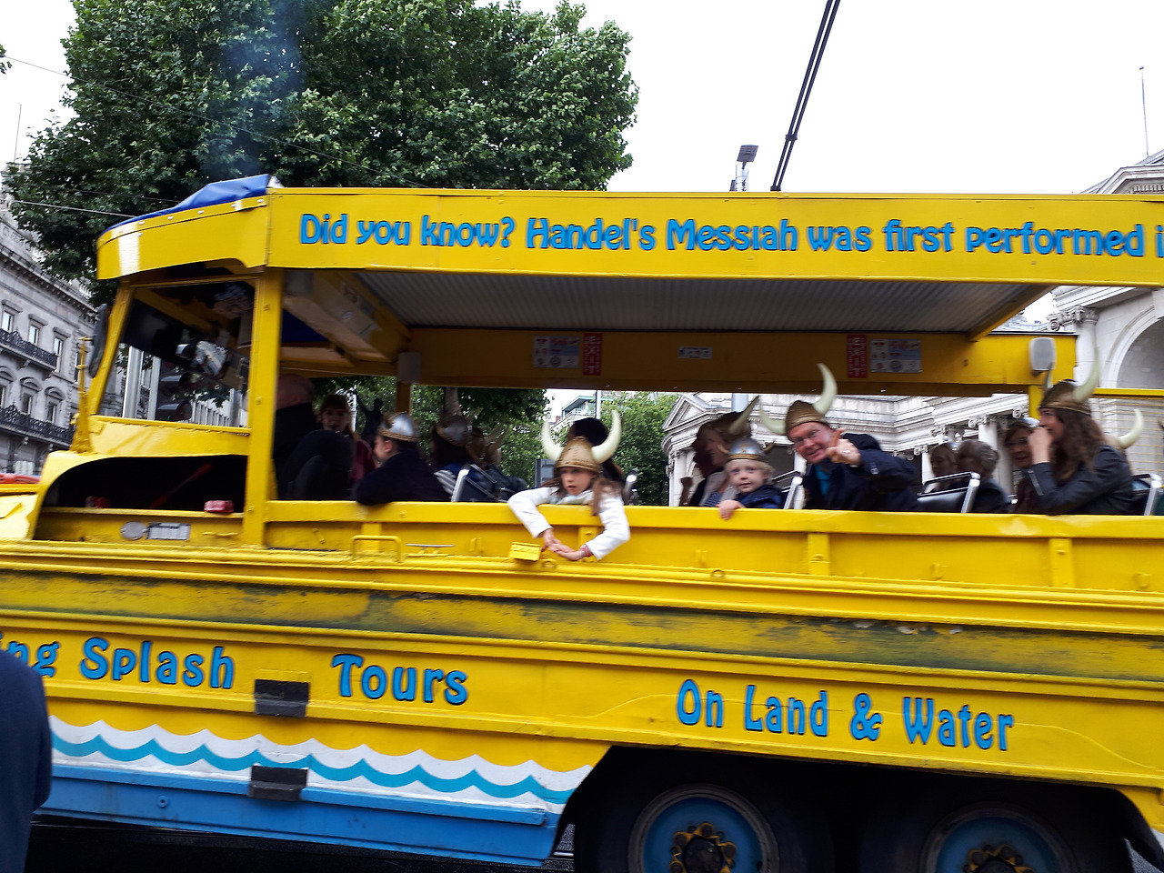 수륙양용의 투어버스가 트리니티 대학앞을 지나가고 있다. 관광객들이 투구 모양의 모자를 쓰고 지나가는 행인들에게 손을 흔든다. 바늘 모양의 스파이어 앞으로 오코넬 동상이 보인다.