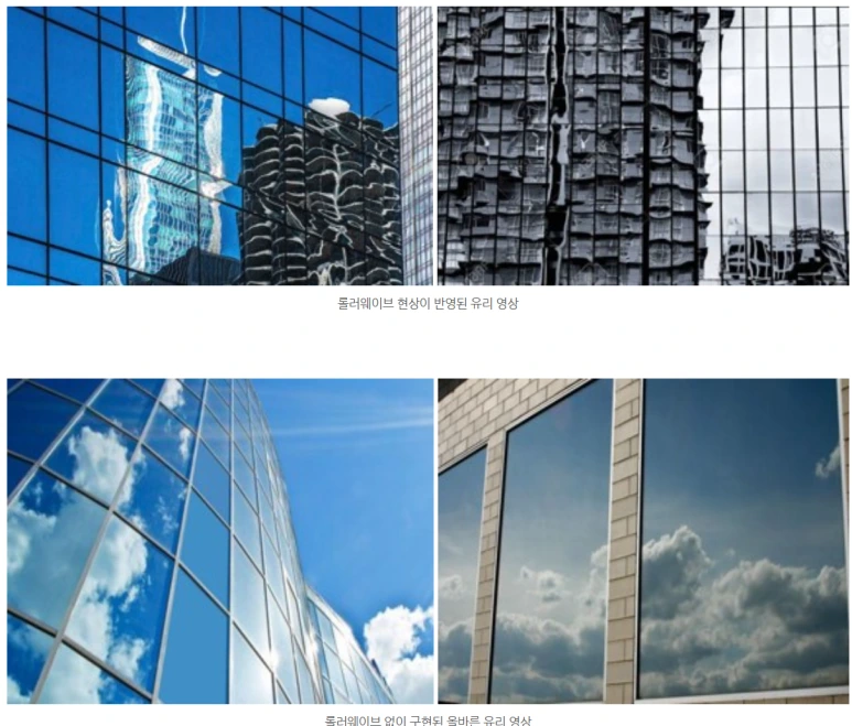 즉 유리 시공과정에서 유리물림 공간이 부적절하거나 프레임 코너 부분에서 각 프레임과 프레임을 연결하는 부위(joint)가 잘 일치하지 못할 경우 반사영상의 변형은 심하게 나타납니다.
