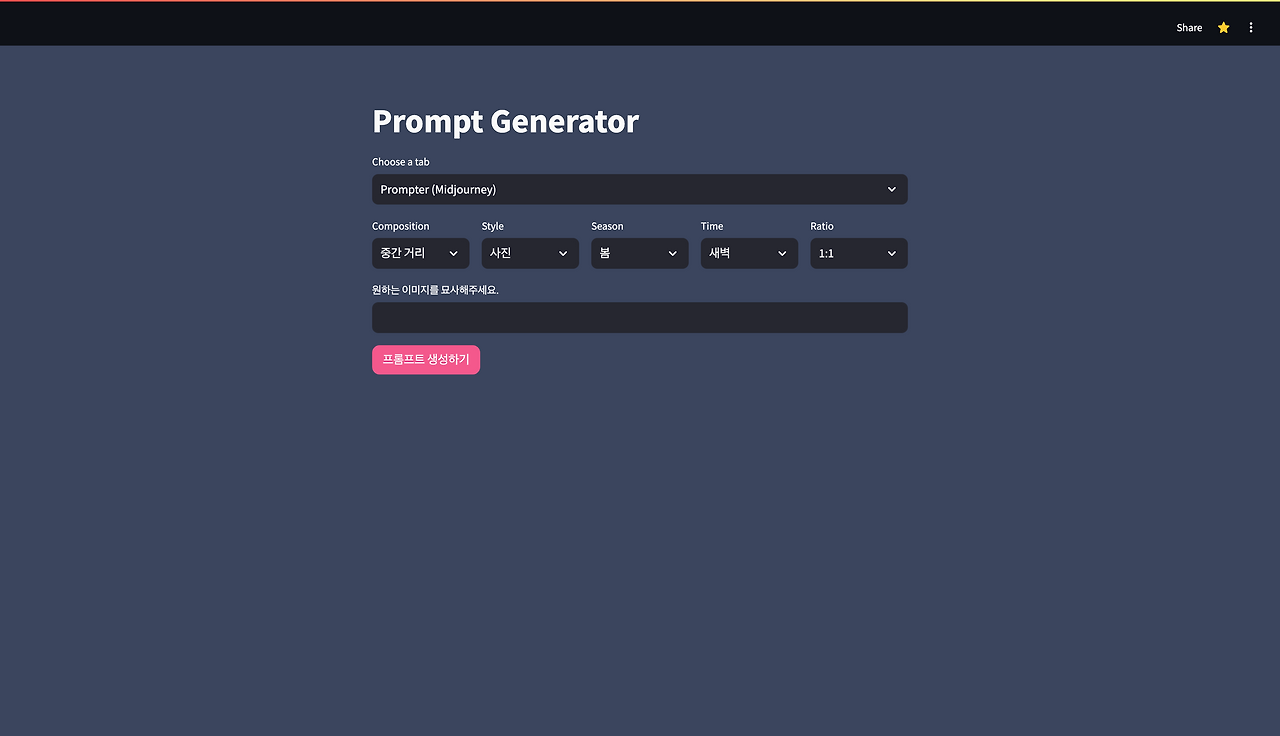 초기 버전은 기본적인 프롬프트 작성 기능과 번역 기능을 중심으로 설계되었습니다. 사용자는 간단한 프롬프트 작성 인터페이스를 통해 스타일, 계절, 시간대 등을 선택하고 이를 바탕으로 AI 도구에서 사용할 프롬프트를 생성할 수 있었습니다. 그러나 사용자의 요구사항에 따라 고급 설정과 세부 설정의 필요성이 제기되었습니다.