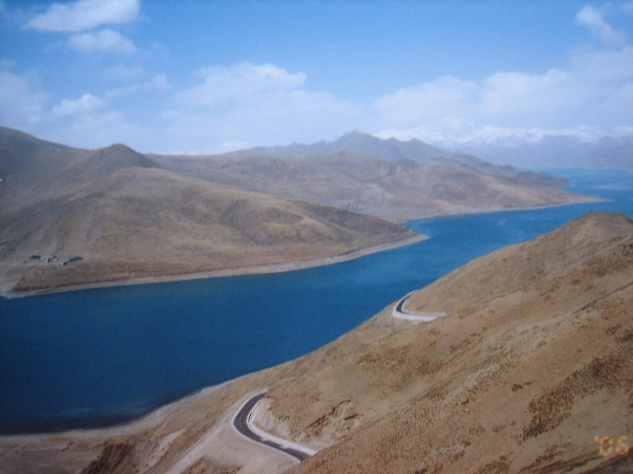 라사의 고도가 3,650m인데 첫날부터 지프는 4.900m가 넘는 캄바라 고개를 넘어 얌드록초 호수를 향해 간다. 올라갈수록 귀가 멍 해지는 느낌이 든다. 이런 곳에 무슨 호수가 있을까,라고 생각하는 순간! 길 왼쪽으로 푸른색의 호수인 암드록초가 그림처럼 펼쳐져 있었다. 암드록초 호수는 하늘빛보다 더 푸른색을 띠고 있었다. 와, 아름답다."라든가 "대박!" 이라든가 하는 말을 하는 사람은 아무도 없었다. 우리는 그저 한동안 아무 말 없이 서서 암드록초의 풍경을 바라보고 있었다.