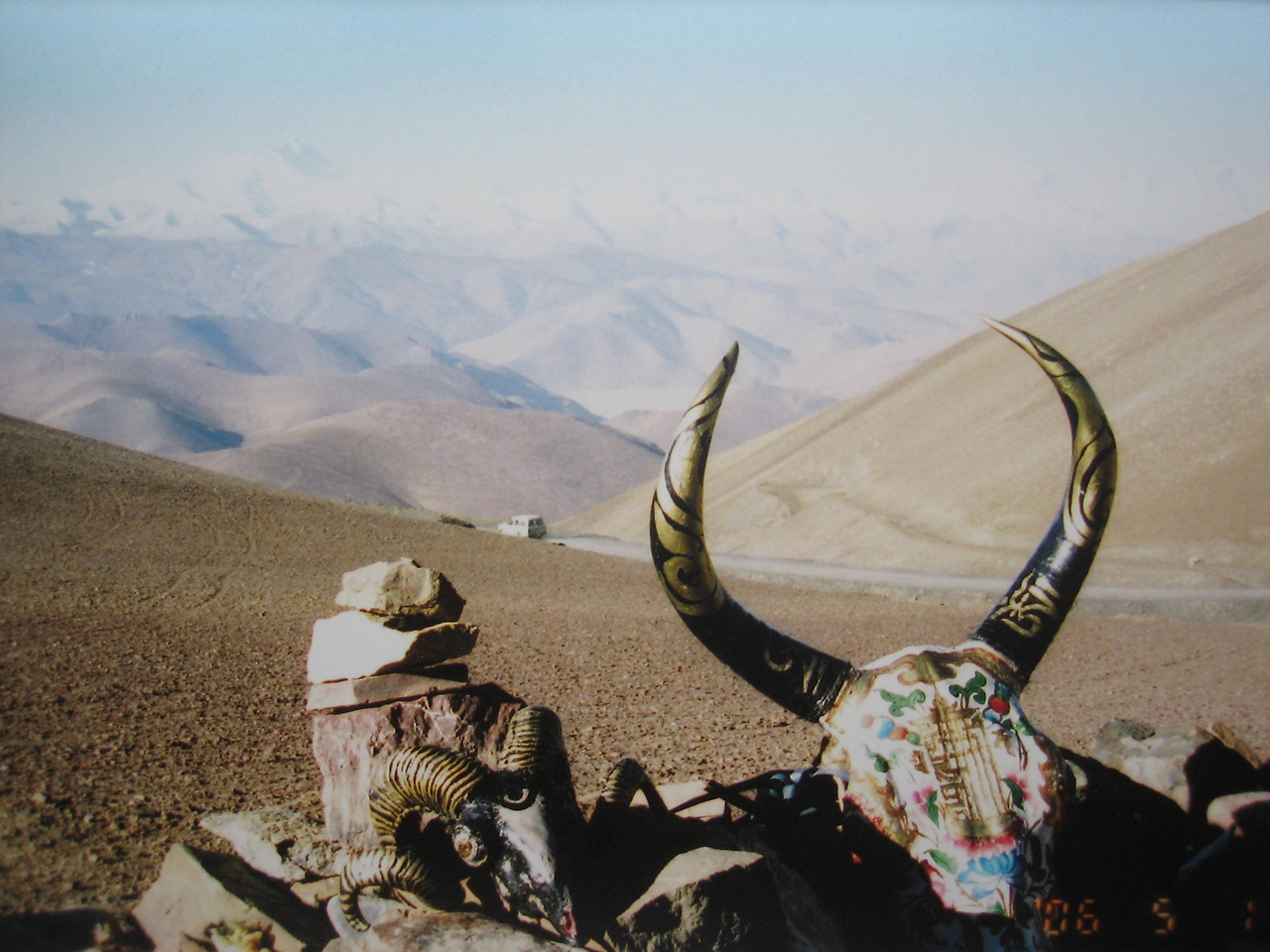 우정공로는 누가 봐도 아름다운 길은 아니다. 너무나 황량하고 척박한 길이다. 몇 시간을 달렸을까. 그림을 그려 넣은 야크 머리뼈가 보여서 지프를 잠시 멈추고 구경했다. 누가 만들었는지 꽤 섬세하게 만들어 놓았다. 운전수에게 왜 이런 곳에 그림이 그려진 야크 머리뼈가 있냐고 물으니, 특별한 이유는 자기도 모르겠단다. 아마도 운전사들의 무사고를 기원하는 것일 거라고 한다. 이유야 어찌 되었든 이런 고산 지대에서는 똥이든 뼛조각이든 그냥 버리는 법이 없다. 풀 한 포기 나무 한 그루 나지 않는 이 곳에서는 야크 머리뼈도 조각품이 되어 여행객들의 시선을 끄는 역할을 하고 있다.