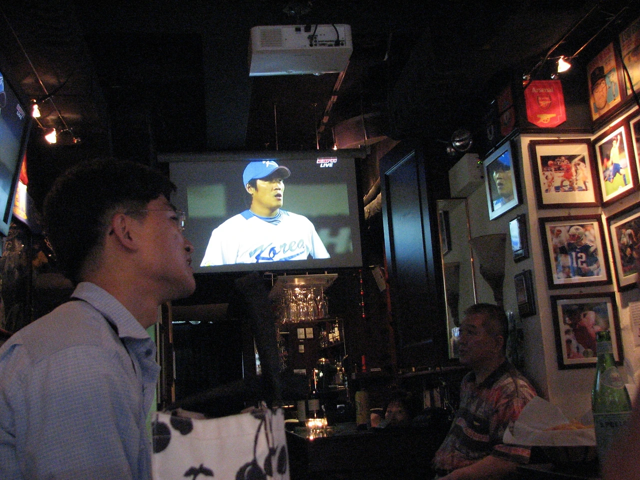 가게 안 손님 구성이 재미있었다. 한쪽 테이블에는 한국인들이 앉아 있었고, 또 다른 쪽에는 일본인들이 각각 자국의 팀을 응원하고 있었다. 그 두 무리는 다국적 기업에서 함께 일하는 회사 동료들인 것 같았다. 한국팀 선두 타자가 2루타를 치고 나가자마자, 김대리라는 분은 열심히 시나리오를 짜기 시작한다. "과장님, 제가 시나리오 한번 짜 볼게요. 다음 타자가 홈런을 쳐서 우리가 2점 납니다. 두고 보세요." 하지만 결과는 삼자 범퇴였고, 허무하게 4회 초가 끝났다. 일본인들은 역투를 펼치고 있는 자국의 투수를 향해 가볍게 박수를 쳐 주었고, 한국인들은 목이 타는지 맥주를 한잔씩 더 주문했다.