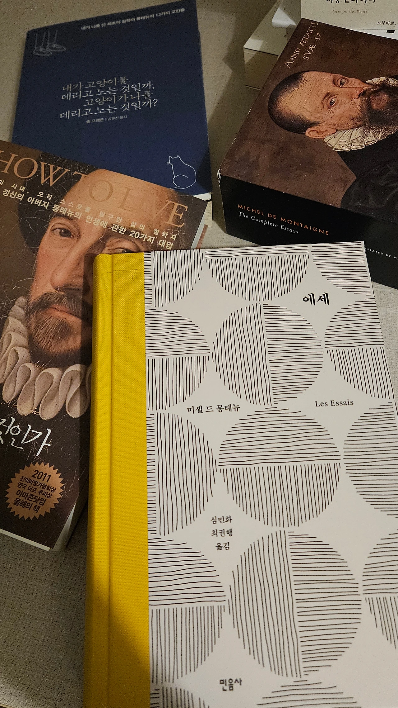 나는 《에세》를 12년 전 군대에서 처음 읽었다. 그 때는 그 책이 《에세》라는 이름으로 불리지 않았고(당시 내가 가지고 있던 판본의 제목은 일본식 번역어인 《수상록》이었다), 완역본도 없었다(내가 가지고 있던 판본도 편역본이었다). 일과가 없는 주말 아침에는 어깻죽지에 그 두꺼운 책을 낀 채로 사무실에 청소를 하러 갔다. 청소를 대충 끝내고는 오후 5시에 영내 스피커로 애국가와 ‘The Star-Spangled Banner’가 울려퍼질 때까지 몽테뉴의 글을 읽다 나오곤 했다. 이제는 세월이 많이 흘러 몽테뉴의 책도 《에세》라는 원래 제목을 되찾았고, 우리말 완역본(심민화, 최권행 선생님 번역)도 나왔다.