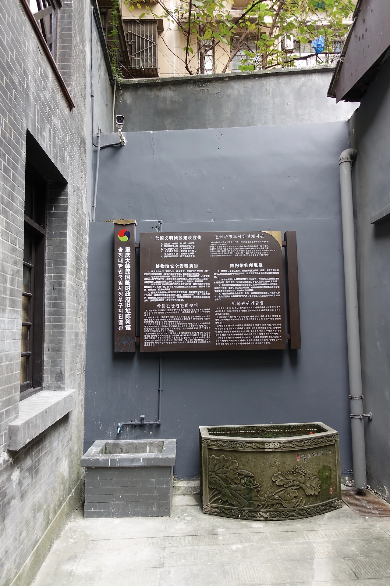 중국에서는 중경대한민국임시정부구지진열관(重庆大韩民国临时政府旧址陈列馆)이라고 한다. 주소는 중경시(重庆市) 유중구(渝中区) 칠성강(七星岗) 연화지(莲花池) 38호(号)이다. 601번, 114번, 413번, 462번, 466번, 476번, 612번 등의 버스를 타고 칠성강(七星岗) 버스정류장으로 하차 후 중경시중의골과의원D구(重庆市中医骨科医院D区) 사이로 난 길로 올라가면 된다. ※ 입장료: 무료 ※ 개방시간: 월요일 휴관, 화~일요일 09:00~16:30