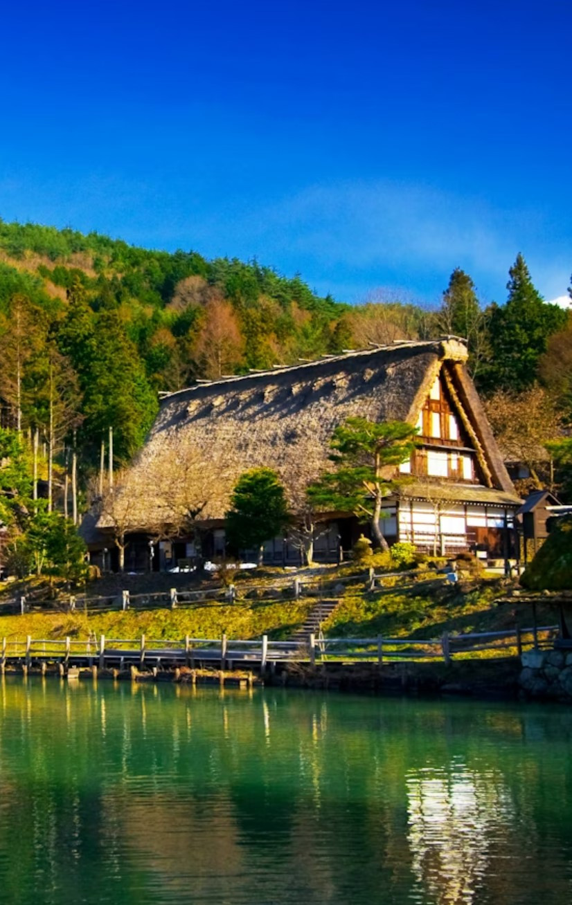 눈의 무게를 견디기 위해 손을 합장한 모양으로 지은 지붕, '갓쇼즈쿠리'.