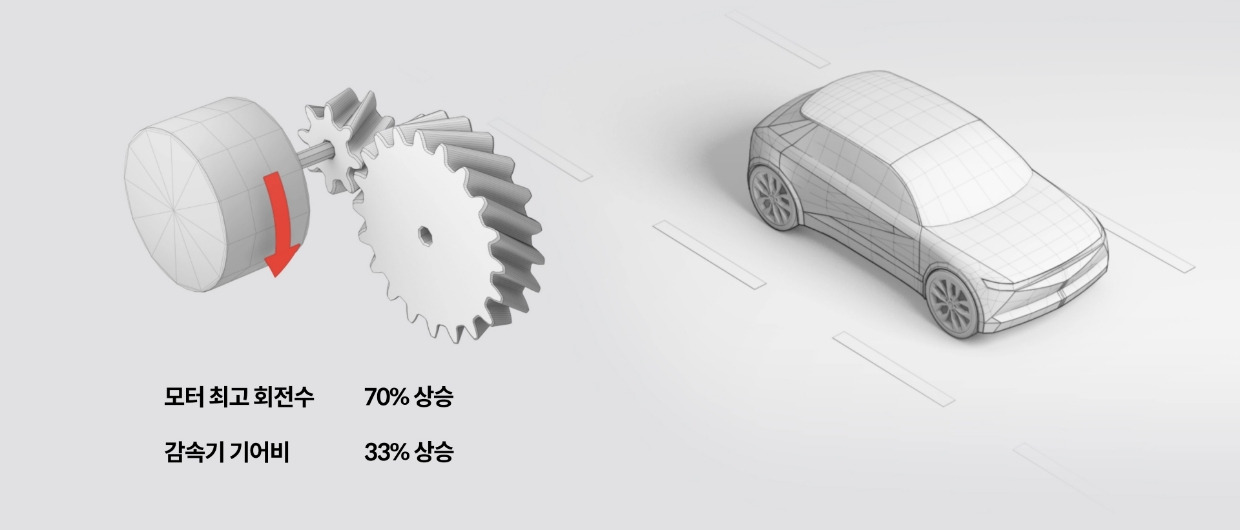 이 수식에서 휠 토크, 즉 바퀴에 전달되는 구동력은 전기 모터의 토크에 감속기의 기어비를 곱한 값으로, 수치가 높으면 전기차의 발진 가속 성능이 뛰어나다는 것을 의미한다. 휠 속도, 즉 바퀴의 회전 속도는 전기 모터의 속도(회전수)를 기어비로 나눠 얻을 수 있으며, 값이 클수록 전기차의 최고속도가 빨라진다. 간단히 말해 전기차 구동계의 모든 조건이 같은 상황에서 모터의 회전수를 높이면 주행 속도를 향상시킬 수 있는 것이다. 아울러 모터의 토크가 동일한 상황에서는 감속기의 기어비를 키워 발진 가속 성능을 증대할 수 있다. 실제로 E-GMP의 전기 모터는 2세대 전기 모터 대비 최고 회전수를 약 70% 상향했고, 감속기 기어비를 33% 상향하여 모터 사이즈를 줄이면서도 휠 토크 및 휠 속도 성능을 각각 20% 가량 개선했다.