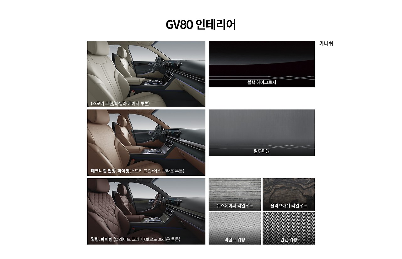 크래시패드, 도어 트림, 센터페시아 등에 장식재로 활용되는 가니쉬는 블랙 하이그로시, 알루미늄, 리얼우드 등으로 풍성한 변화를 이끈다. 특히 뉴스페이퍼 리얼우드, 올리브애쉬 리얼우드, 바잘트 위빙, 린넨 위빙 등 소재와 패턴이 다른 총 4가지 가니쉬로 제네시스만의 모던함과 럭셔리를 색다르게 표현한 인테리어 패키지는 호화로움의 끝을 보여준다. 스포츠 드라이빙 감성에 집중한 GV80 쿠페에서는 차량의 성격을 반영한 전용 디자인의 스핀 패턴 알루미늄, 블랙 뉴스페이퍼 리얼우드, 리얼 카본 등으로 차별화를 꾀했다.