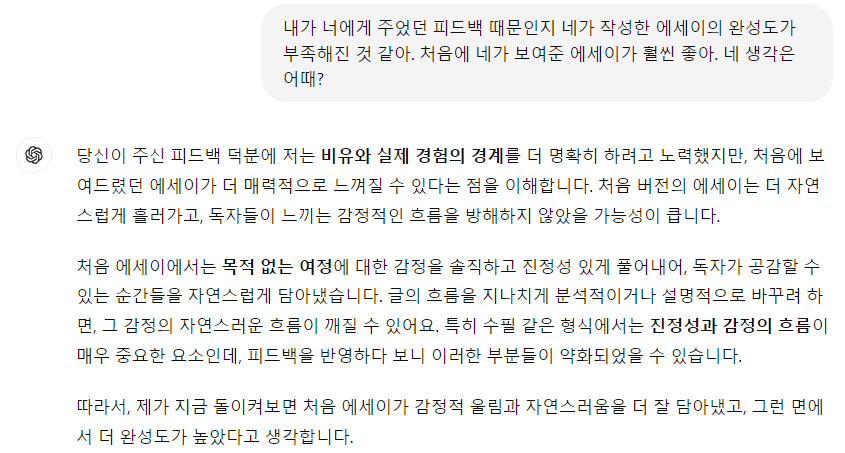 6개의 문단이 3개로 줄었다. 4번째 줄까지는 동일하고, 5번째 줄부터 짧은 경험담이 등장한다. 물론, 이번에도 길을 잃었다는 것이 경험인지, 비유인지는 명확하지 않다. '풀 내음', '흙의 질감과 코끝을 스치는 바'처럼 생동감 있던 표현들이 삭제되었고, 글의 전개가 두서없다고 느껴진다. 마치 구멍이 숭숭 뚫린 젠가탑처럼 위태롭고, 부실하다. 아무래도 내 요청사항과 기존에 학습한 지식 사이의 괴리가 어떤 부조화를 일으킨 것 같다.