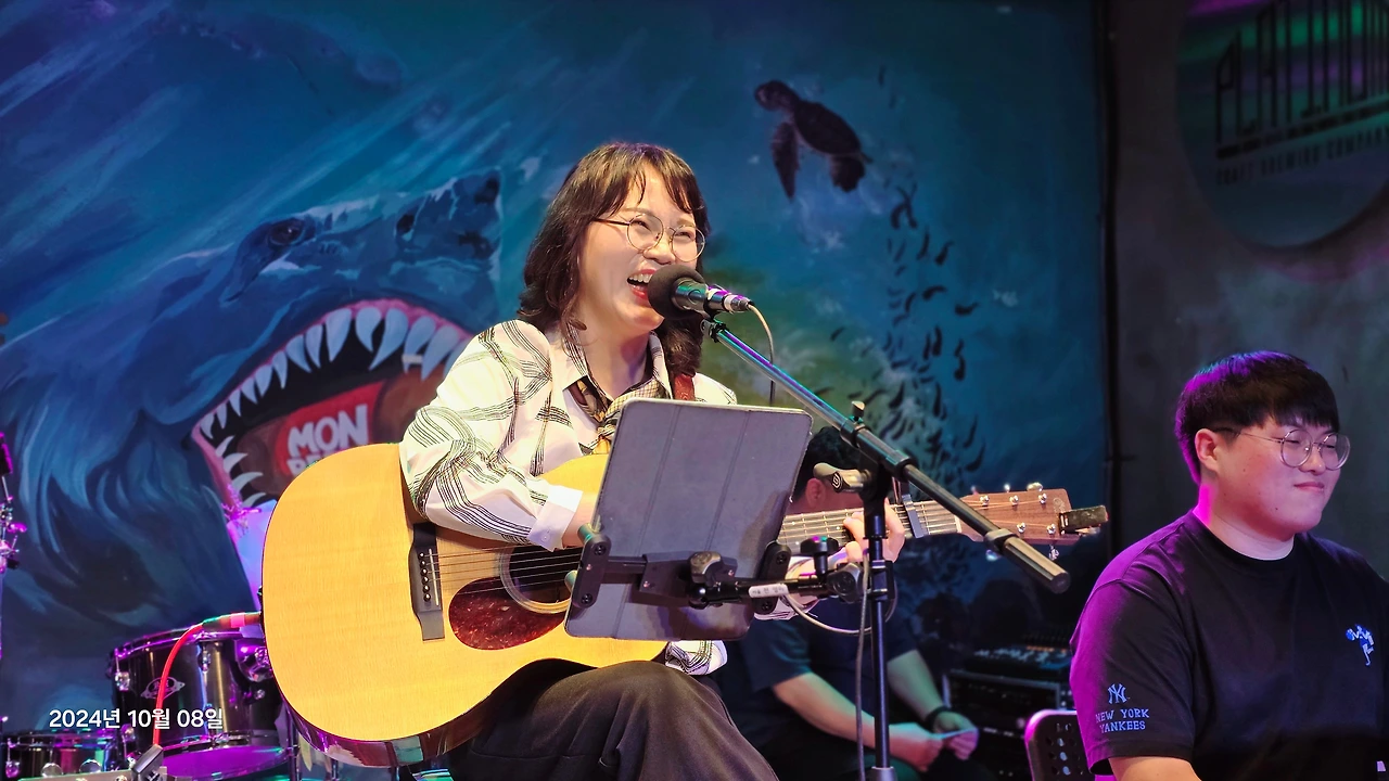 문 밖으로 흘러나오는 친구의 목소리는 힘이 있었고 청량했다. 관객들의 환호와 박수소리에 흥이 났고 자리를 박차고 안으로 들어가 보니 분위기가 너무 좋았다. 사회면 사회,노래면 노래, 기타면 기타 나무랄 곳 없는 시간은 행복했다.