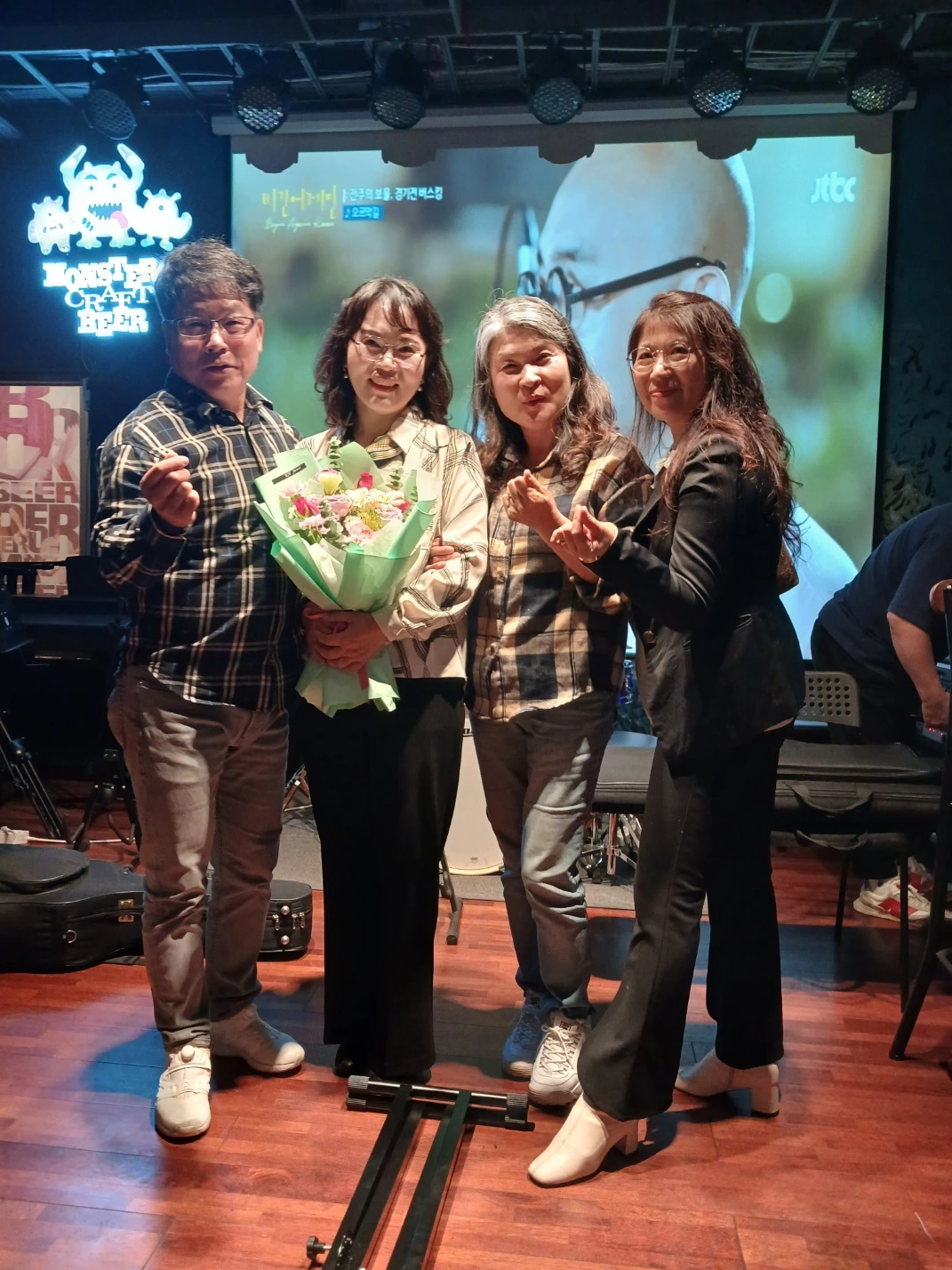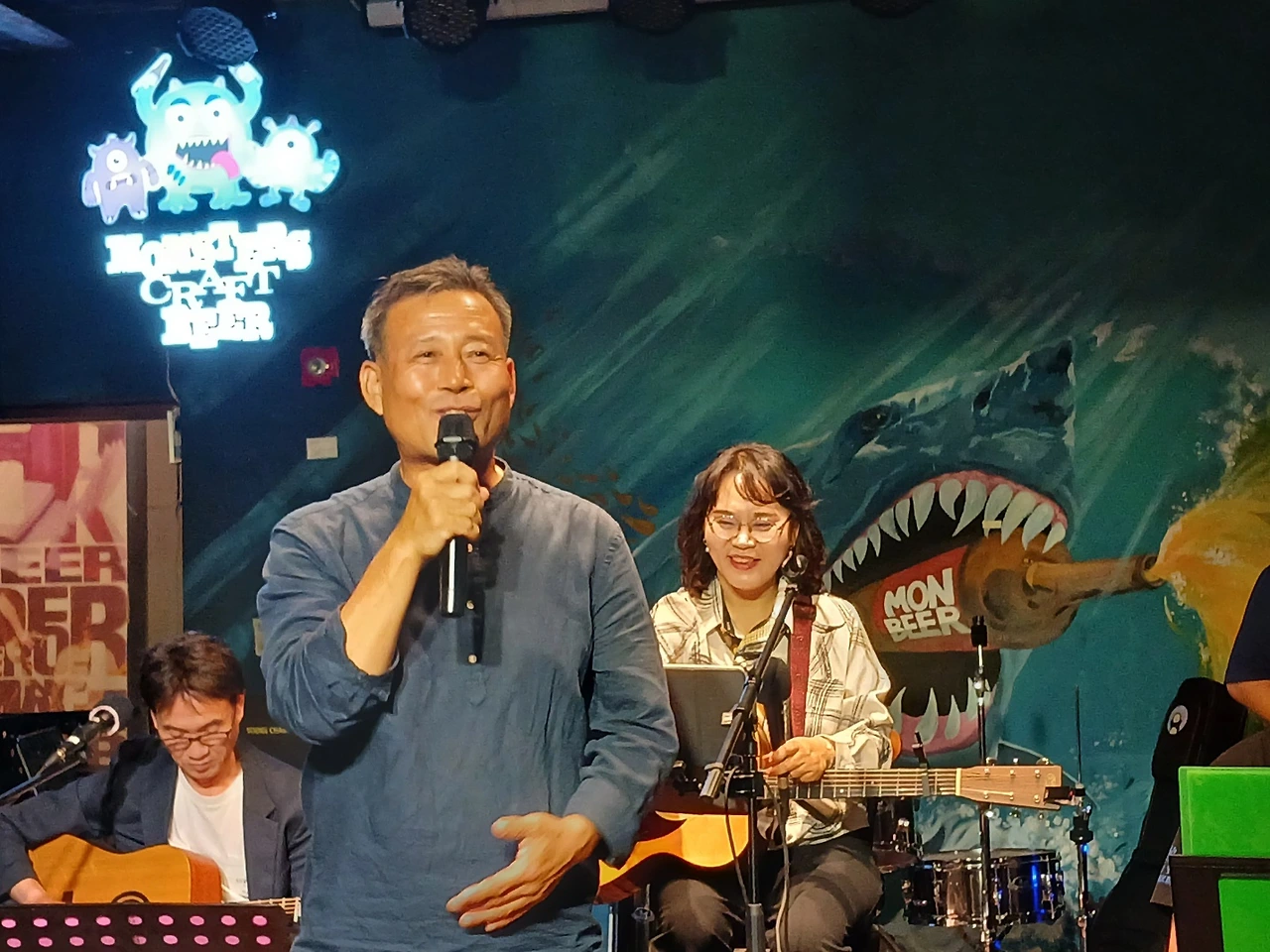 6시 넘어 좀 일찍 도착하였고 생각보다 분위기가 좋은 몬스터 호프집은 120석이 마련되었고 출연진들은 리허설 마무리 중이었다. 몇 분과 함께 저녁으로 국밥을 급히 먹고 7시 10분 티켓배부를 위해 내 자리로 갔다. 이른 시간에 손님들은 몰려왔고 좌석은 차츰차츰 메워졌고 어느새 좌석은 매진이었다. 예매. 현매로 120석은 가득했고 친구의 지인과 동호인들과 친구부군님의 지인으로 가득 찬 이곳에서 노래가 시작되었다.