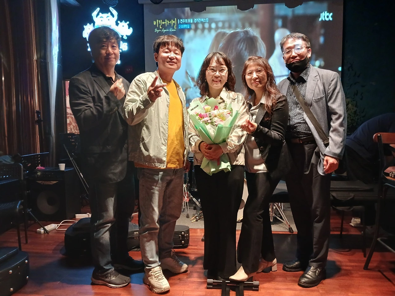 6곡이 준비가 되었고 나는 늦게 오시는 손님을 위해 내 자리를 비울 수가 없어 노래도 제대로 듣지 못하고 왔다 갔다 해야 했다. 관객의 박수를 유도하며 이어지는 시간들 응원도구를 준 비 해 온 또 다른 친구의 재치 덕분에 분위기는 무르익어갔고 열띤 응원 속에 마지막 곡이 흘러나왔다. 마지막 곡이라는 말에 앞에 지인이 핸드폰 라이트를 켜기에 나도 바로 라이트를 켜 일어서서 라이트를 켜달라고 돌아다니면서 눈짓 몸짓으로 부탁드렸다.
