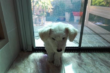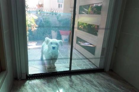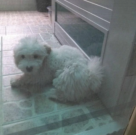 현관문 방충망 앞에서 집안으로 들어오고 싶어 하는 아롱이