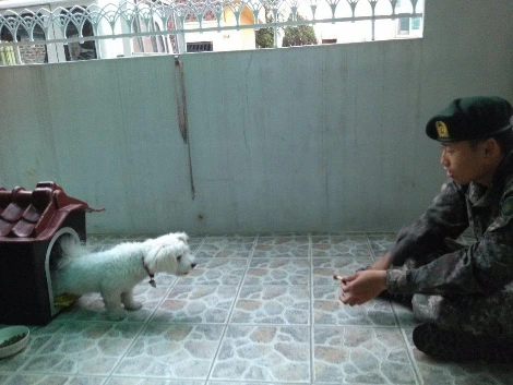 2013년 5월 5일 아롱이가 아줌마 집에 오게 되었을 때 오빠는 군대에 있었습니다. 오빠는 군대에 있을 때 집에 아롱이라는 강아지를 키우게 되었다는 말을 듣고 나 아롱이가 어떤 강아지인지 무척 궁금했대요. 그리고 오빠가 2013년 6월 첫 휴가를 나오던 날 오빠와 아롱이의 역사적인 첫 만남이 이루어졌습니다.
