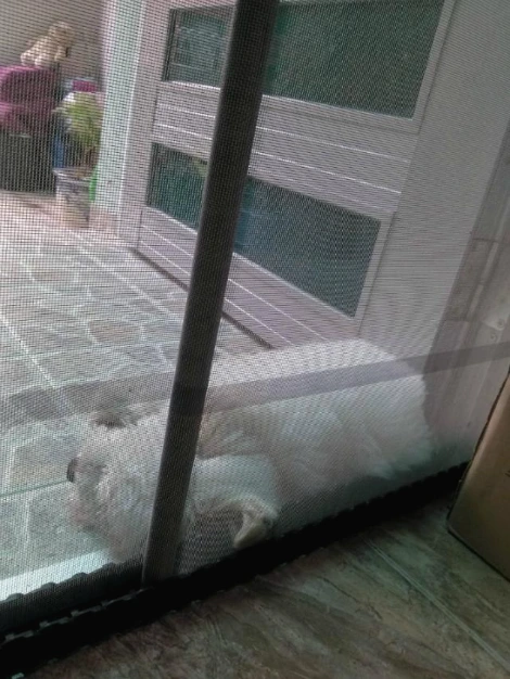 아예 방충망에 기대어 드러누워버린 아롱이